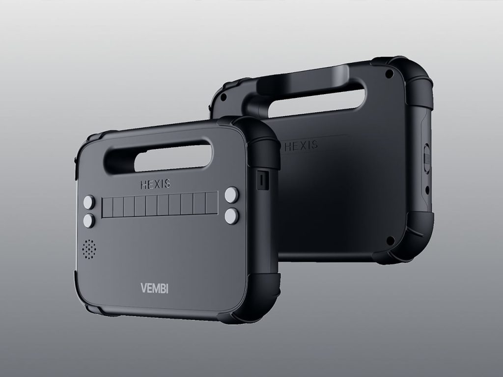 Contrairement à de nombreux dispositifs d’assistance qui sont souvent encombrants et fragiles, le Vembi Hexis est léger, compact et conçu pour être utilisé facilement par les enfants. Son design imite celui d’une tablette robuste, rendant l’utilisation d’un appareil éducatif plus familière et moins intimidante.