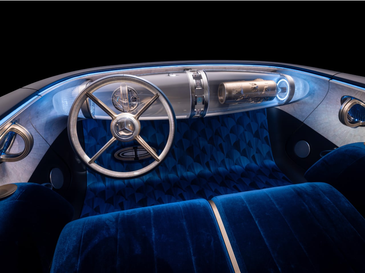 Le volant à quatre branches place un logo Mercedes-Benz flottant dans une sphère en verre au centre, enserré par les branches comme un bijou. Même le sol reçoit le traitement Art Déco, avec une marqueterie en paille élaborée dans un motif classique en éventail. Chaque surface raconte la même histoire : c’est une voiture conçue pour ceux qui comprennent que le luxe signifie s’entourer d’objets nécessitant un savoir-faire humain pour leur réalisation.