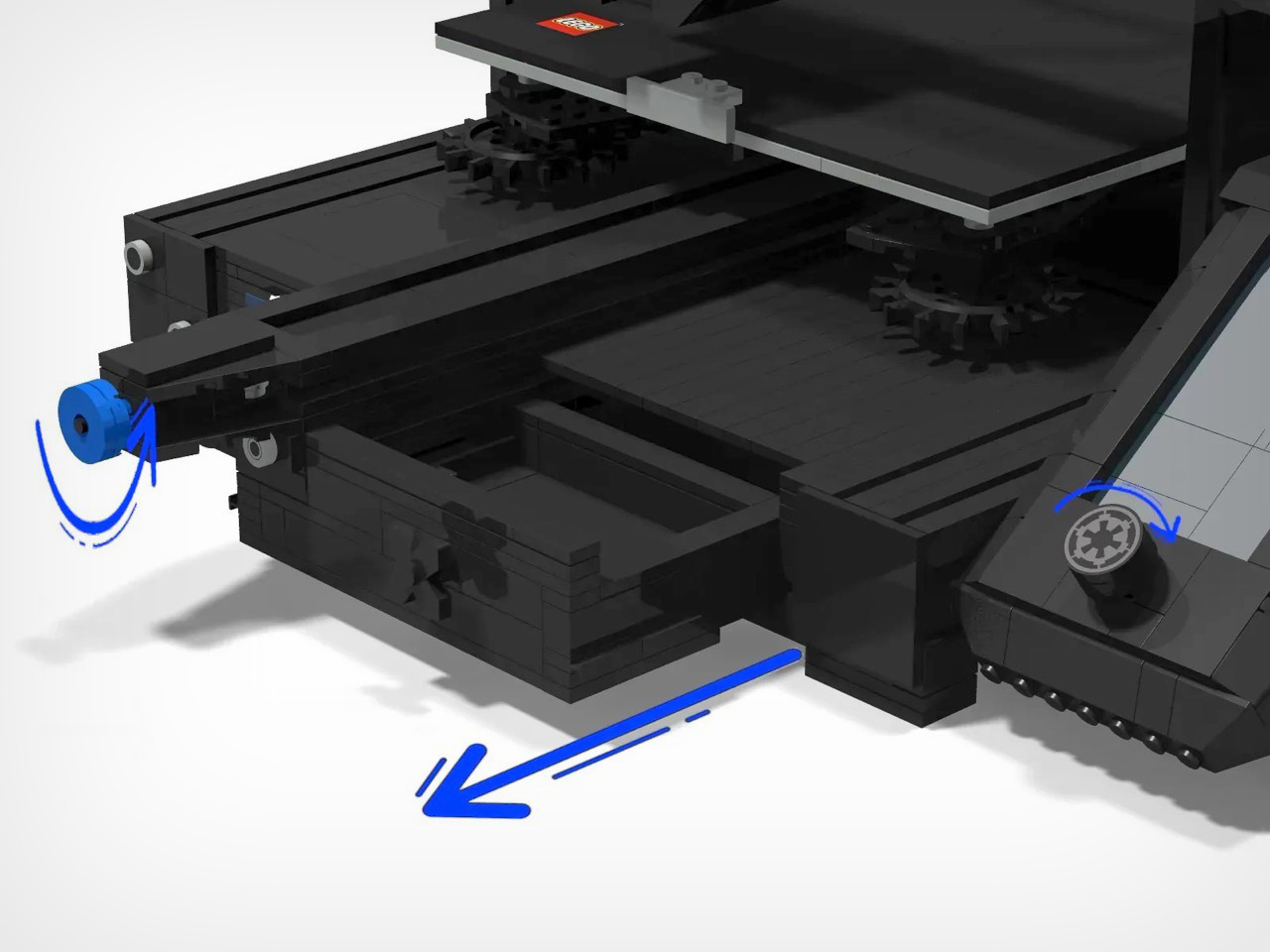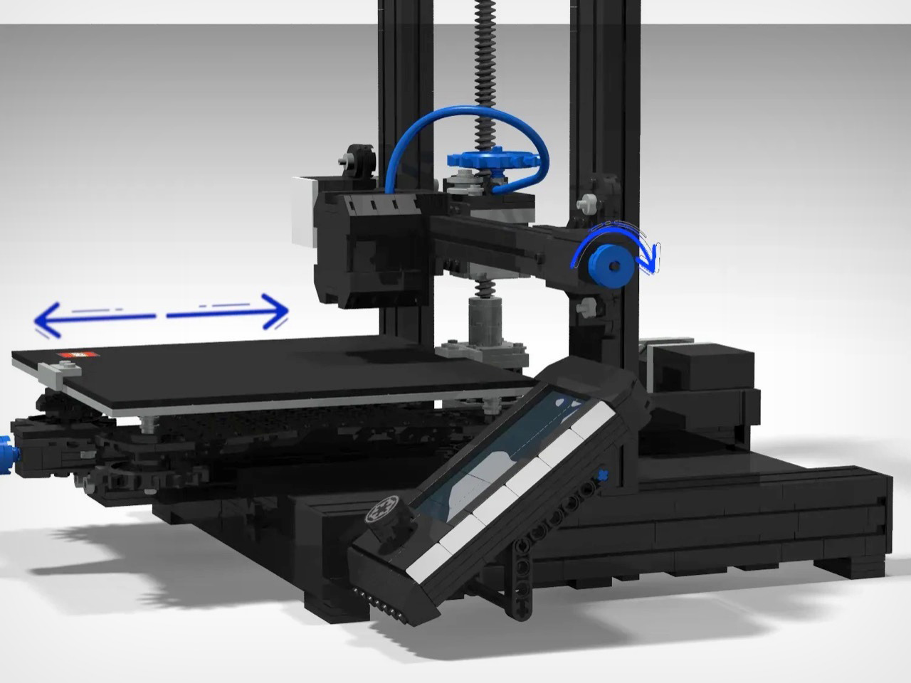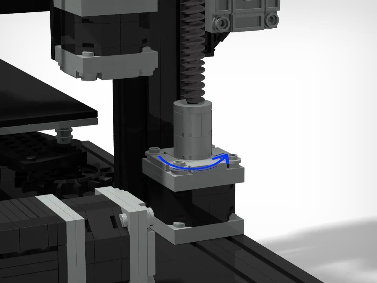 La plaque de construction est placée sur un assemblage d’axe Y avec son propre mécanisme à vis à rouleaux, et on trouve même un logo LEGO sur la plaque de construction, comme un branding parfaitement placé.