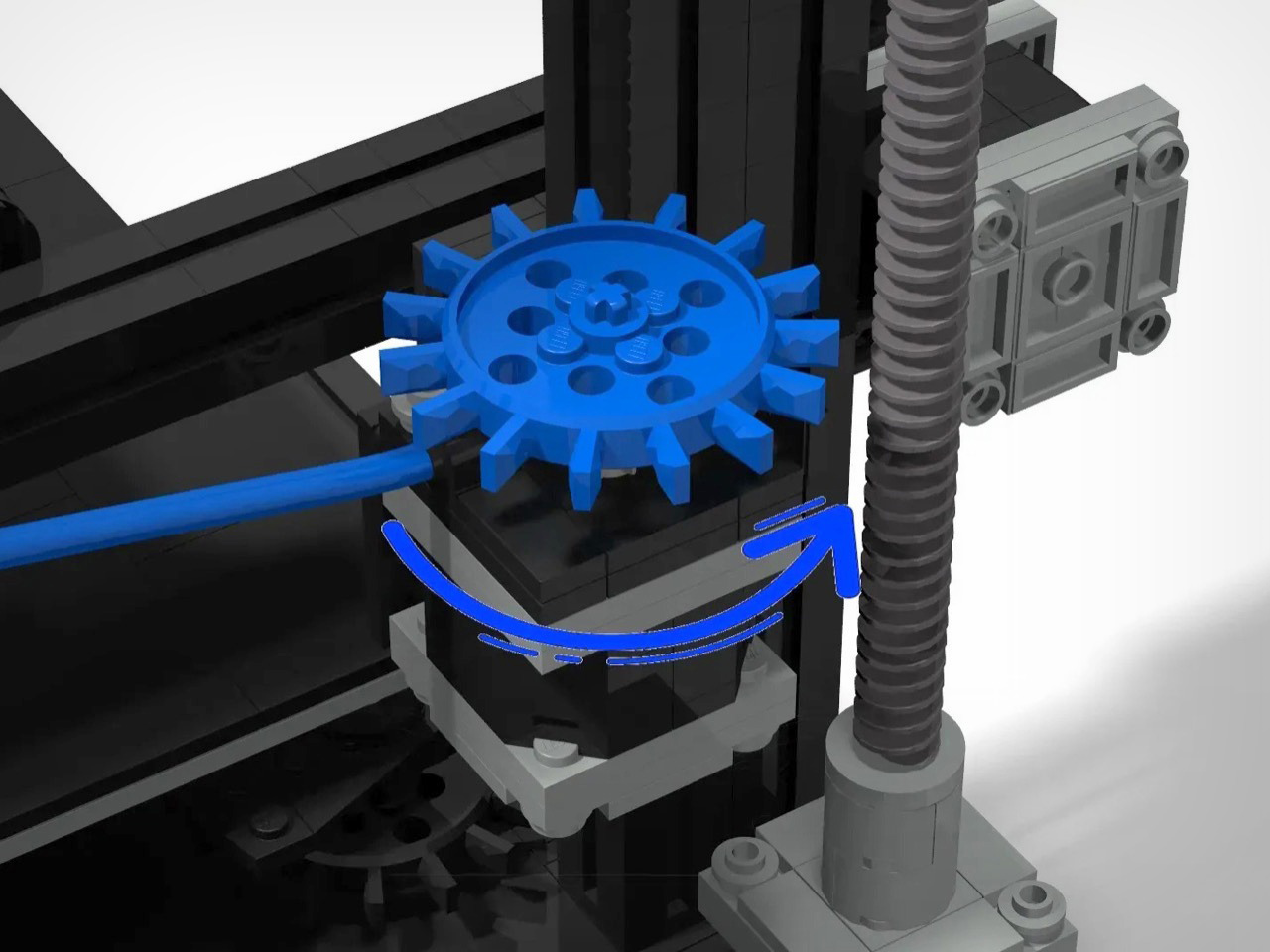 Ce qui est impressionnant, c’est la manière dont les systèmes mécaniques sont traduits dans le vocabulaire LEGO sans abandonner complètement l’exactitude. L’axe Z utilise ce qui semble être des pièces de tuyaux nervurés de LEGO pour représenter les vis à rouleaux, tandis que le chariot peut se déplacer le long des supports verticaux. Le chariot de l’axe X glisse sur une poutre noire imitant l’extrusion en aluminium 2040 trouvée sur de véritables Enders, tandis que l’ensemble hotend pend d’un chariot avec ce tuyau Bowden bleu caractéristique.