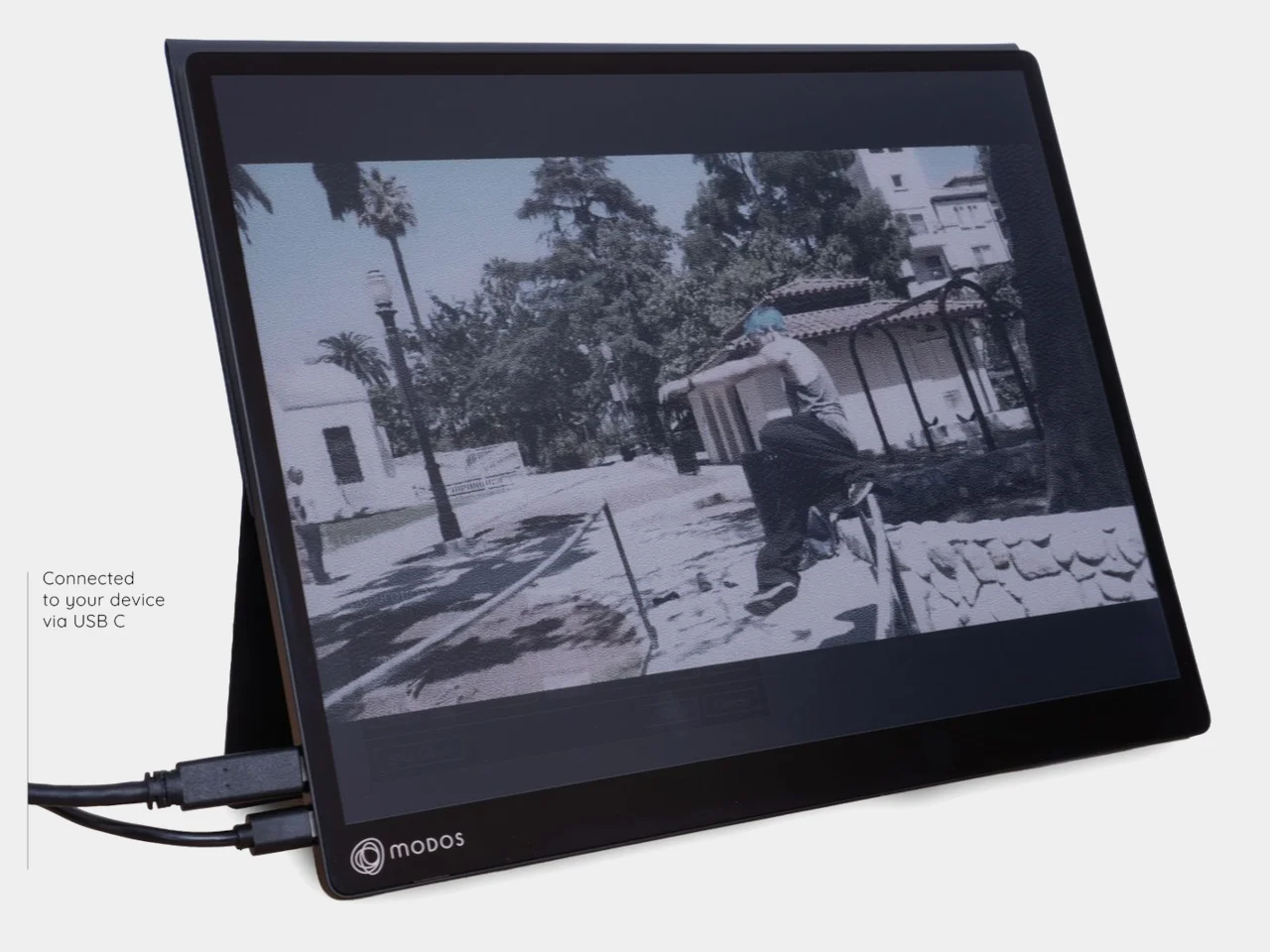 Le Modos Flow se connecte via USB-C avec prise en charge du mode alternative DisplayPort, permettant une configuration propre avec un seul câble.