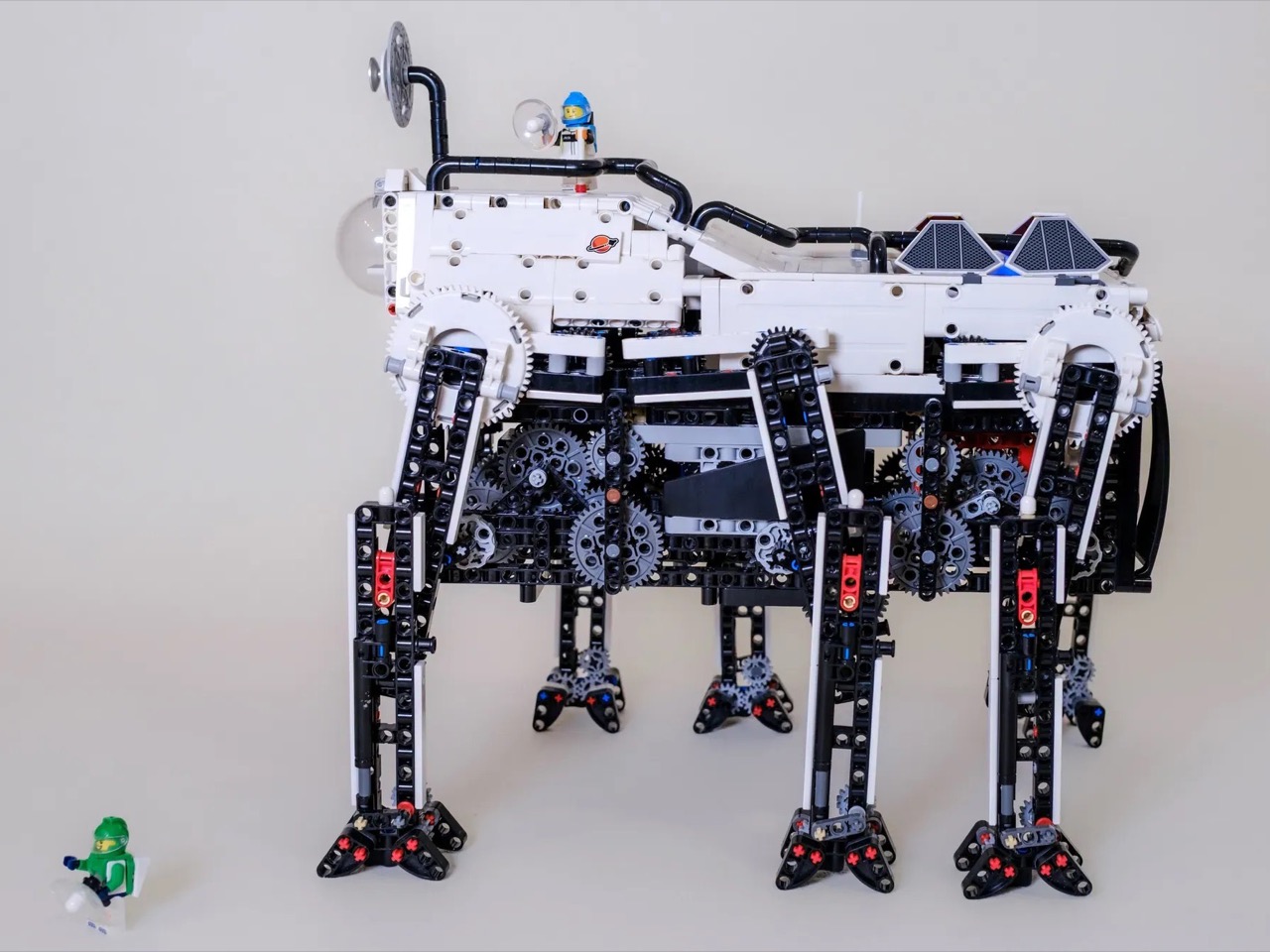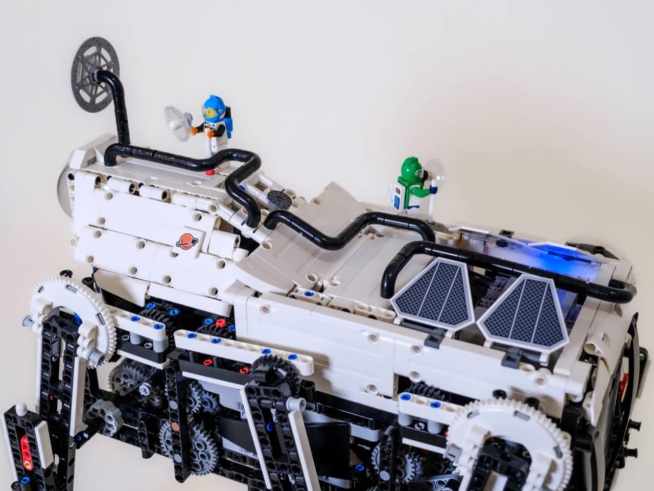 Le marcheur présente des panneaux blancs, une structure noire, des panneaux solaires bleus, et un cockpit élevé pour deux figurines d’astronautes. Il est également stylisé pour ressembler à un rover d’exploration spatiale.