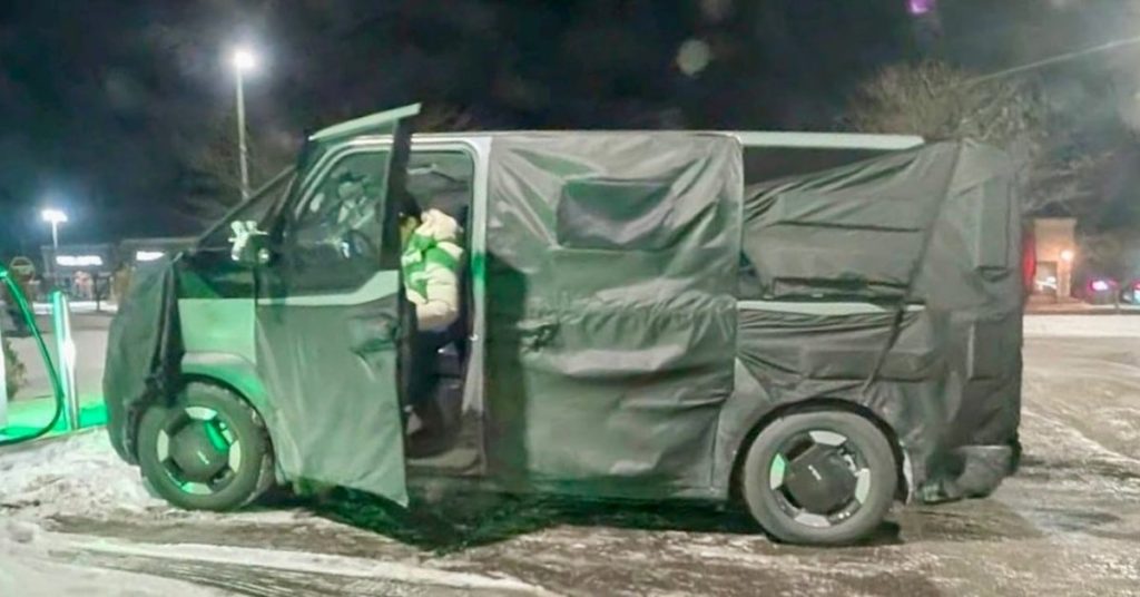 La photo, gracieusement fournie par KindelAuto, montre un PV5 camouflé à une station de recharge en Indiana. Malgré le camouflage, on peut voir que le van électrique de Kia semble être légèrement plus grand que le