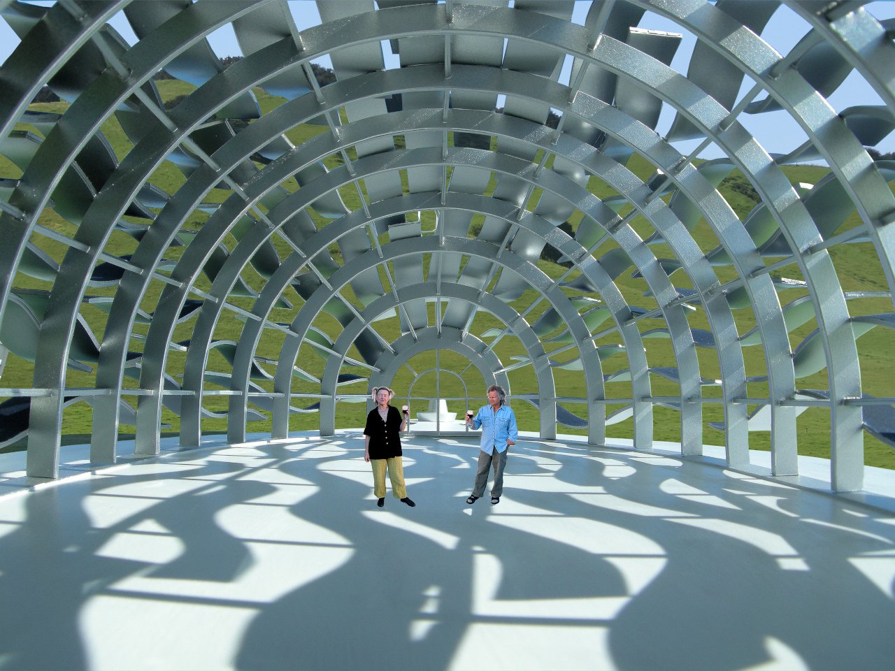 Les arches en acier et les supports horizontaux qui se trouvent en dessous fournissent le cadre structurel qui est habillé de panneaux de verre pouvant s’ouvrir et se fermer automatiquement pour le contrôle de la ventilation naturelle. Ce système adaptatif permet au pavillon de réagir aux conditions climatiques tout en maintenant une esthétique fluide. Une version entièrement en plein air pourrait éliminer complètement le verre, créant ainsi un espace de rassemblement ombragé pur.
