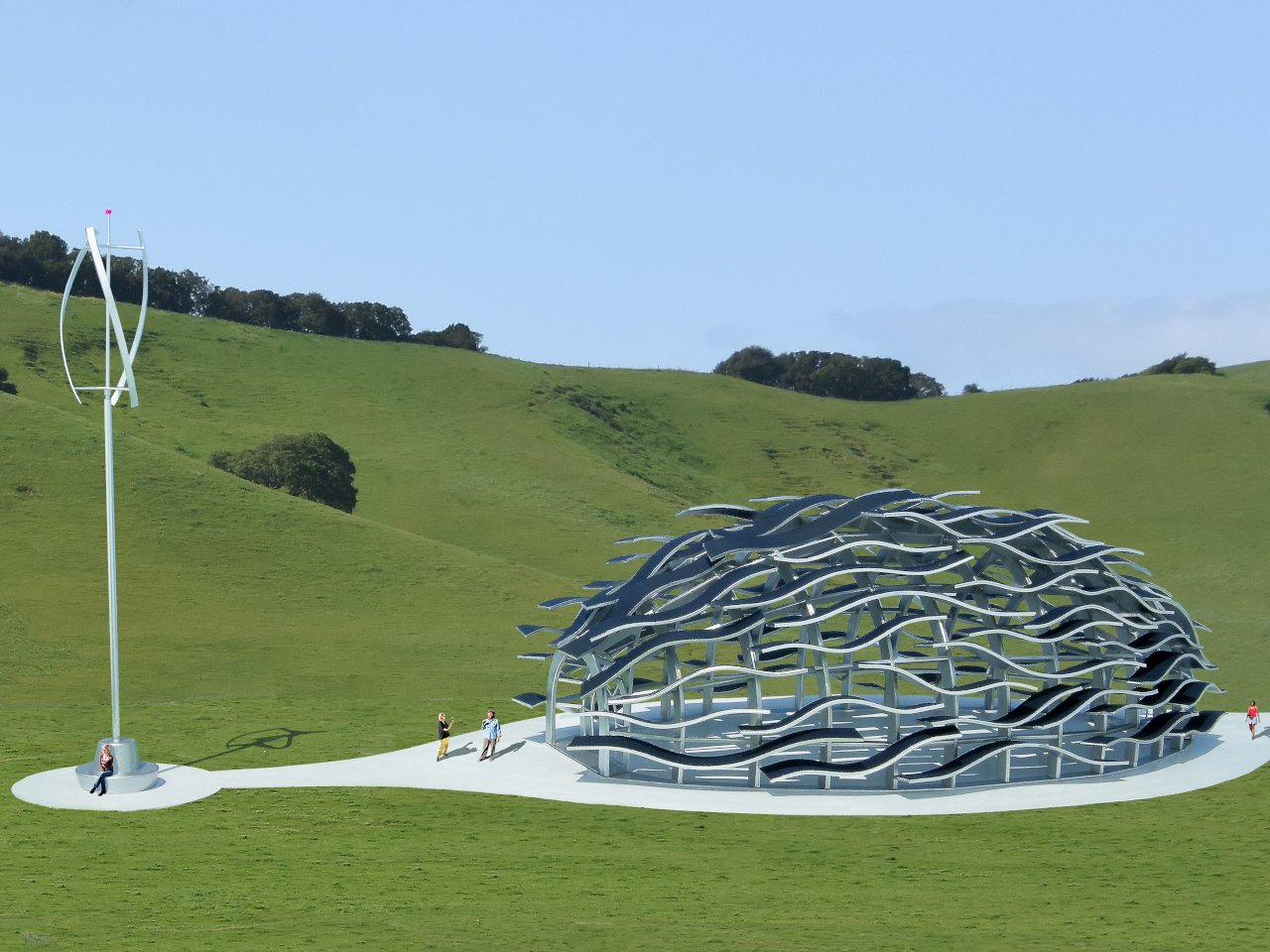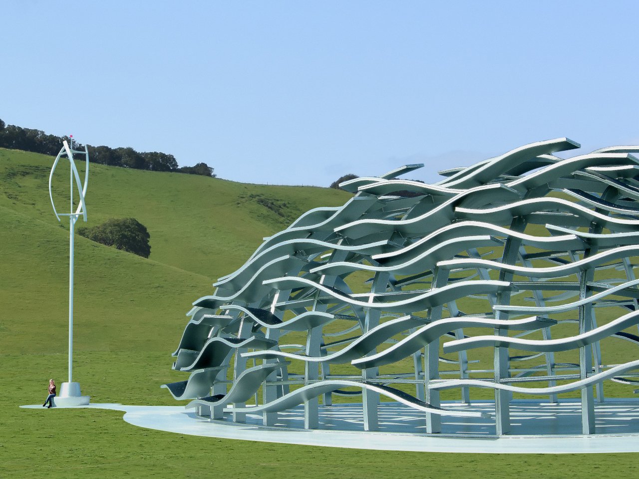 Par ailleurs, l’éolienne à axe vertical, adjacente au pavillon, ajoute une autre couche de génération d’énergie et de drame visuel. Le profil élégant de l’éolienne complète la forme sculpturale du pavillon, tandis que le banc circulaire construit autour de sa base crée un espace contemplatif pour les visiteurs, leur permettant d’observer à la fois la technologie et le paysage environnant.
