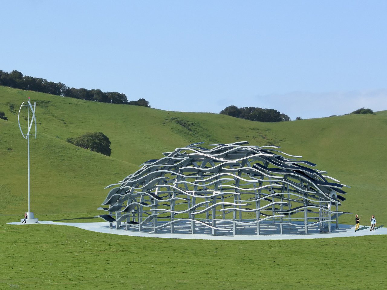 La forme du pavillon attire immédiatement l’attention avec sa série de panneaux en acier incurvés qui semblent balayer la structure comme des vagues figées. Ces panneaux, formés avec deux rayons différents, créent un auvent dynamique et ondulant qui fait écho aux collines de la région vinicole. L’effet est à la fois organique et futuriste, comme si des ceps de vigne avaient inspiré une œuvre sculpturale architecturale.