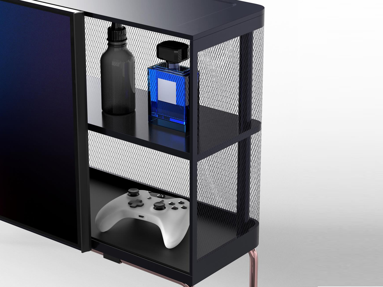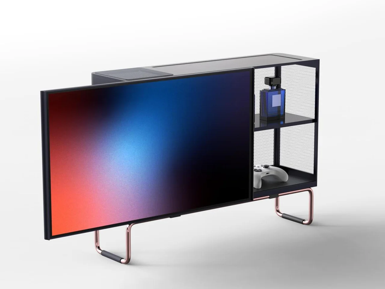 À l’avant, l’écran du monitor glisse sur le côté pour révéler ou dissimuler les étagères de rangement internes. Les haut-parleurs et l’emplacement pour l’alimentation du Kakao se retrouvent sur le panneau inférieur, tandis que les ports de connectivité sont situés sur le côté. Ce dernier choix pose néanmoins question, car il risque d’entraîner une accumulation de câbles à l’extérieur de l’ordinateur tout-en-un, contredisant ainsi son véritable objectif. Il serait judicieux que le designer envisage de repositionner les ports à l’intérieur avec des découpes pour câbles afin de garantir un espace désencombré.
