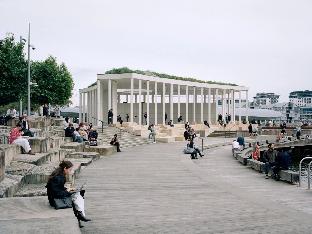 Le Pier Pavilion est conçu comme un espace public accueillant, favorisant le rassemblement, la détente et l’appréciation des vues sur le port. Il offre un abri contre le soleil et la pluie, étant accessible tout au long de l’année.