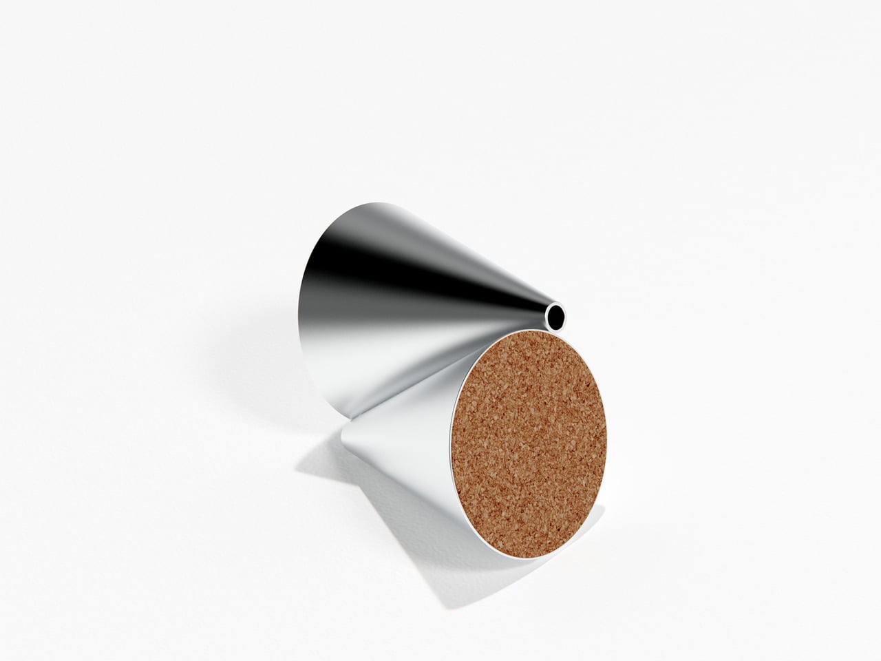 Konus est usiné en aluminium avec une finition satinée qui capte la lumière en douceur, sans attirer l’attention de manière excessive. La base en liège empêche le support de glisser sur un bureau lisse, ajoutant une note de chaleur aux surfaces dures. Cette combinaison de métal froid et de liège chaud lui confère l’apparence d’une petite œuvre architecturale de bureau, plutôt que celle d’un simple gobelet en plastique. Cet objet se remarque sans devenir une distraction, apprenant à l’utilisateur à l’apprécier subtilement.