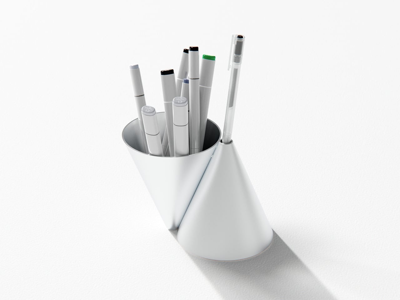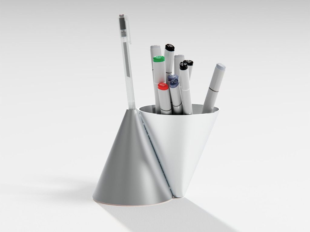 Le cône plus grand sert de conteneur pour différents stylos et marqueurs, tandis que le cône plus petit est destiné à un stylo spécial, aidant à établir une hiérarchie fonctionnelle sur votre bureau.