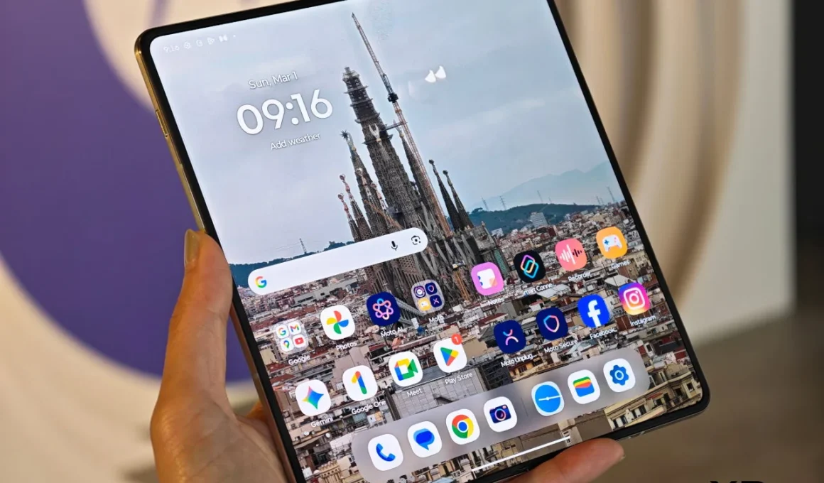 Contrairement aux anciens modèles de style clapet du RAZR qui se pliaient verticalement, le RAZR Fold est un pliage de style livre. Lorsque vous l’ouvrez, un écran LTPO 2K s’affiche, capable d’atteindre une luminosité de 6,200 nits. Cette luminosité permet une utilisation confortable même en pleine lumière du soleil. L’écran est suffisamment large pour exécuter trois applications côte à côte sans donner l’impression d’être encombré. Lorsqu’il est fermé, un écran externe de 6,6 pouces offre la plupart des fonctionnalités que l’on attend d’un smartphone, rendant l’appareil très fonctionnel.