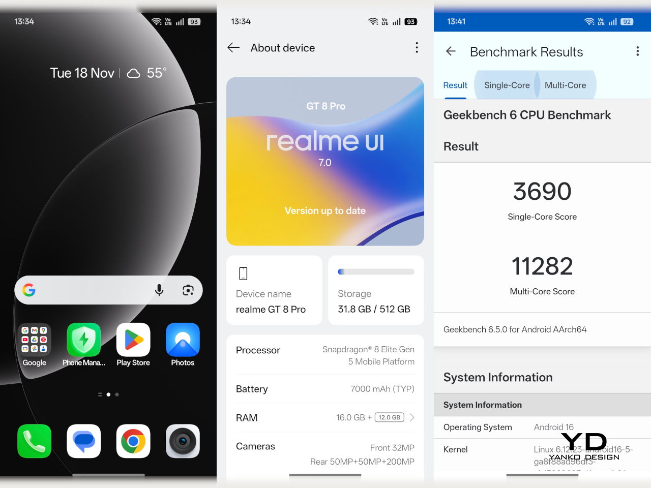 Le GT8 Pro est équipé du dernier chipset Snapdragon 8 Elite Gen 5, conçu pour le multitâche, les jeux exigeants et les fonctionnalités avancées d’IA. Realme accompagne ce processeur d’options de 12 Go ou 16 Go de RAM et de 256 Go ou 512 Go de stockage UFS 4.1, selon la configuration. Sur le plan logiciel, Android 16 avec Realme UI 7 offre une interface colorée et riche en fonctionnalités tout en restant intuitive.