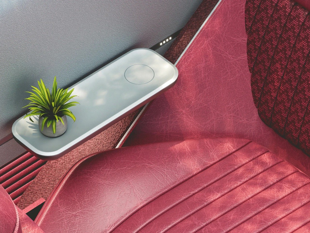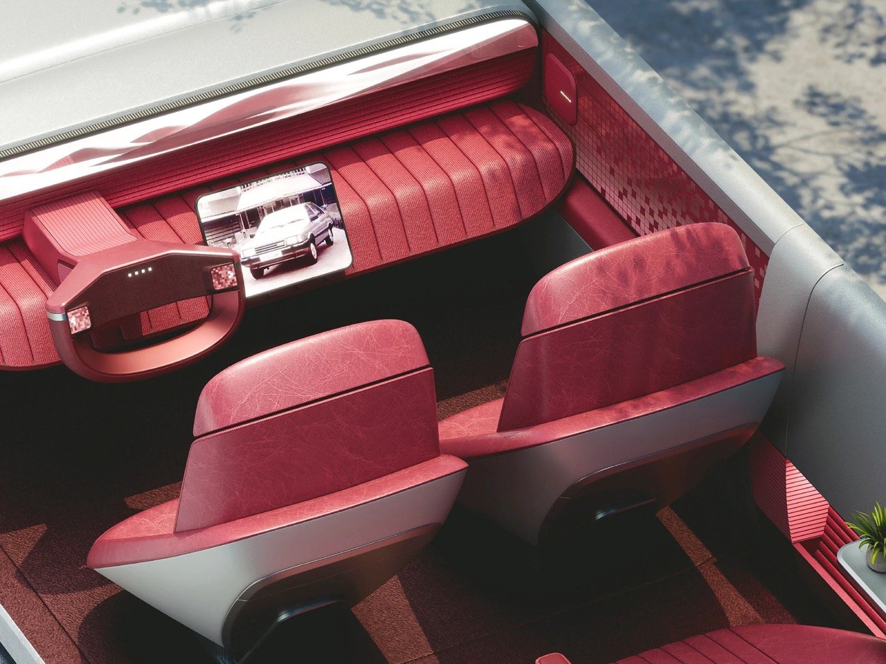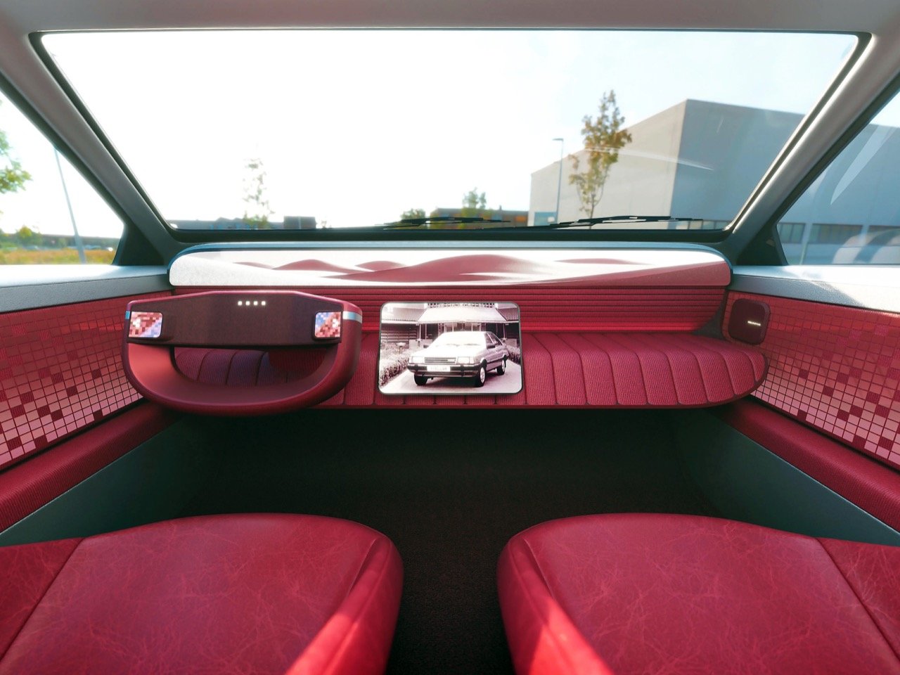 L’intérieur est dominé par un revêtement rouge profond, avec un tableau de bord horizontal intégrant des surfaces texturées. Un volant de type yoke, des sièges confortables et des éléments ludiques, comme une étagère flottante pour une plante, ajoutent une touche unique.