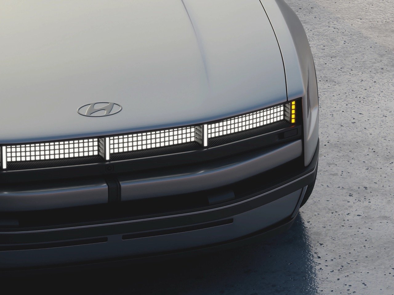 Le design se distingue par son langage lumineux pixelisé, hérité de l’Ioniq 5, et par des proportions qui mélangent géométrie des années 1980 et attentes modernes. Il présente une grille LED unique qui fait office de signature visuelle.