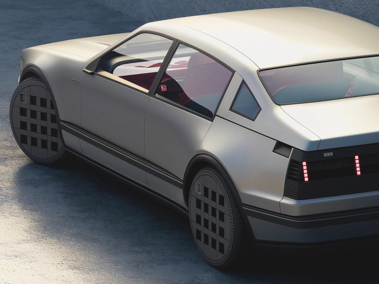 Les roues méritent une mention particulière. Leur design semi-enveloppant, avec des découpes en grille, continue le motif pixelisé du reste de la voiture. Bien que ces roues puissent poser des problèmes de refroidissement des freins et ajouter du poids non suspendu, leur visualisation dans ce rendu souligne une cohérence esthétique impressionnante. La finition noire mate ancre le corps argenté métallique, apportant un contraste frappant.