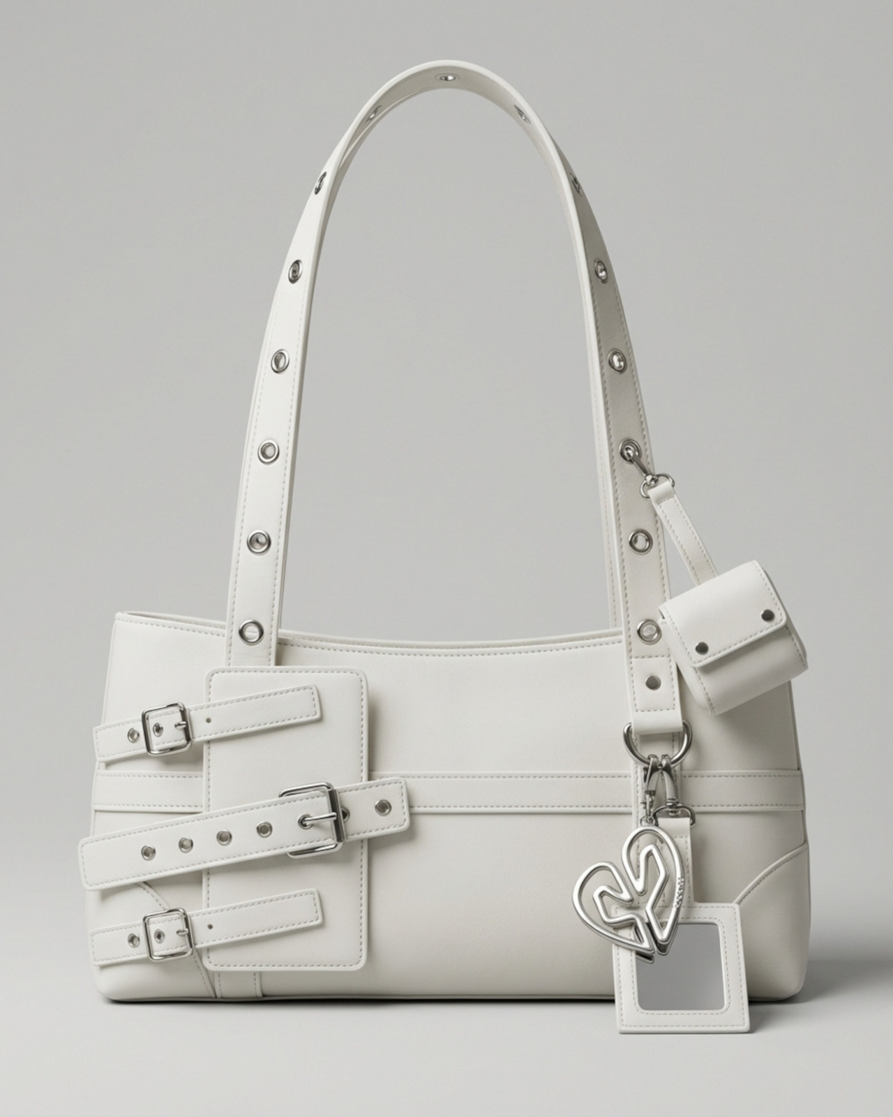 L’élément le plus direct qui fait référence aux caractéristiques matérielles se trouve le long des poignées. Cette partie du sac est agrémentée d’œillets argentés agencés de manière à imiter les anneaux du module de la caméra du Galaxy S26 Ultra. Ce détail, au départ décoratif, prend tout son sens une fois que l’on réalise son inspiration, transformant le sac et le téléphone en complices d’un clin d’œil stylistique.