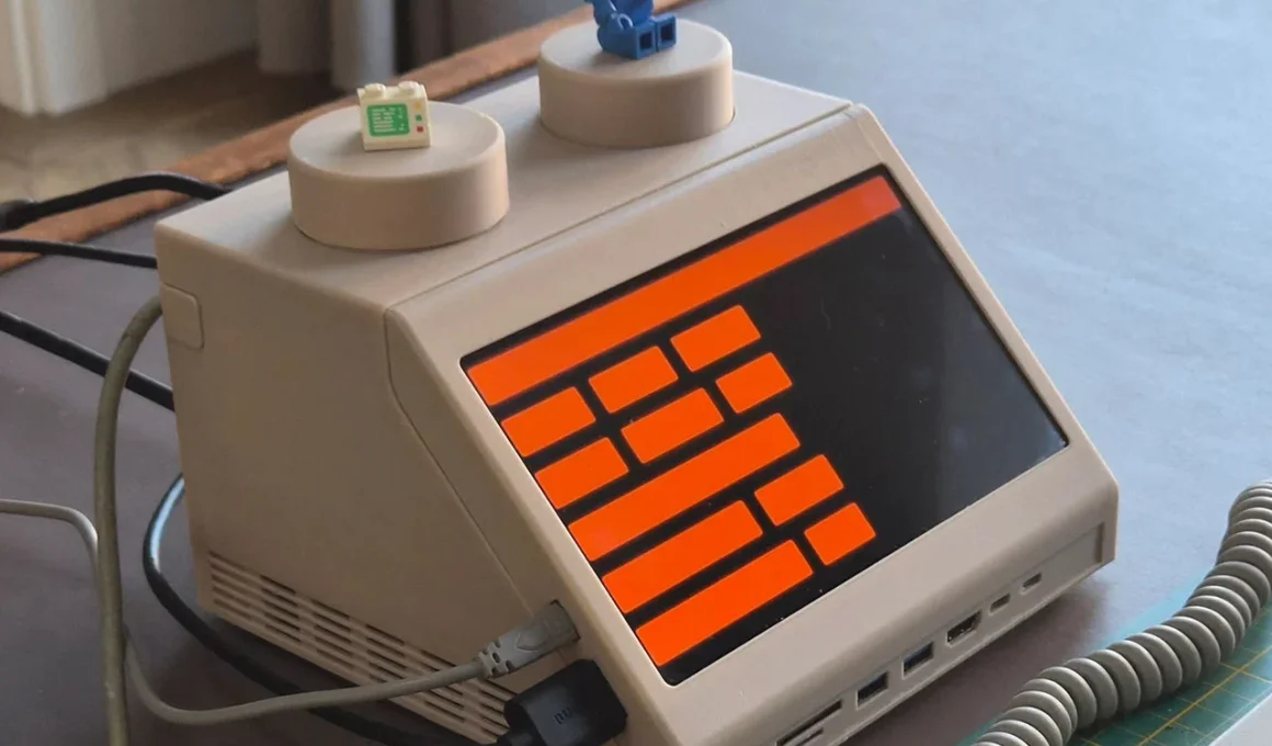 L’une des caractéristiques les plus intéressantes de la M2x2 est son écran tactile IPS de 7 pouces intégré à l’avant. Cet écran, tout en rappelant les graphiques imprimés sur la brique LEGO d’origine, offre une interface fonctionnelle pour des informations système rapides ou des tableaux de bord. Paul Staal utilise cet écran pour contrôler son système de maison intelligente via une interface de Home Assistant, tout en travaillant sur un écran externe plus grand.