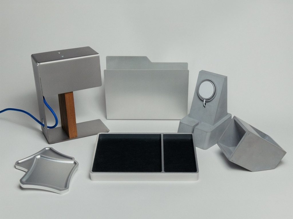 Le nouveau set de papeterie en aluminium adopte une esthétique brutaliste, caractérisée par des angles vifs, une palette monochromatique et des surfaces épurées. Il reflète un design minimaliste et industriel qui évoque l’équipement de bureau traditionnel.