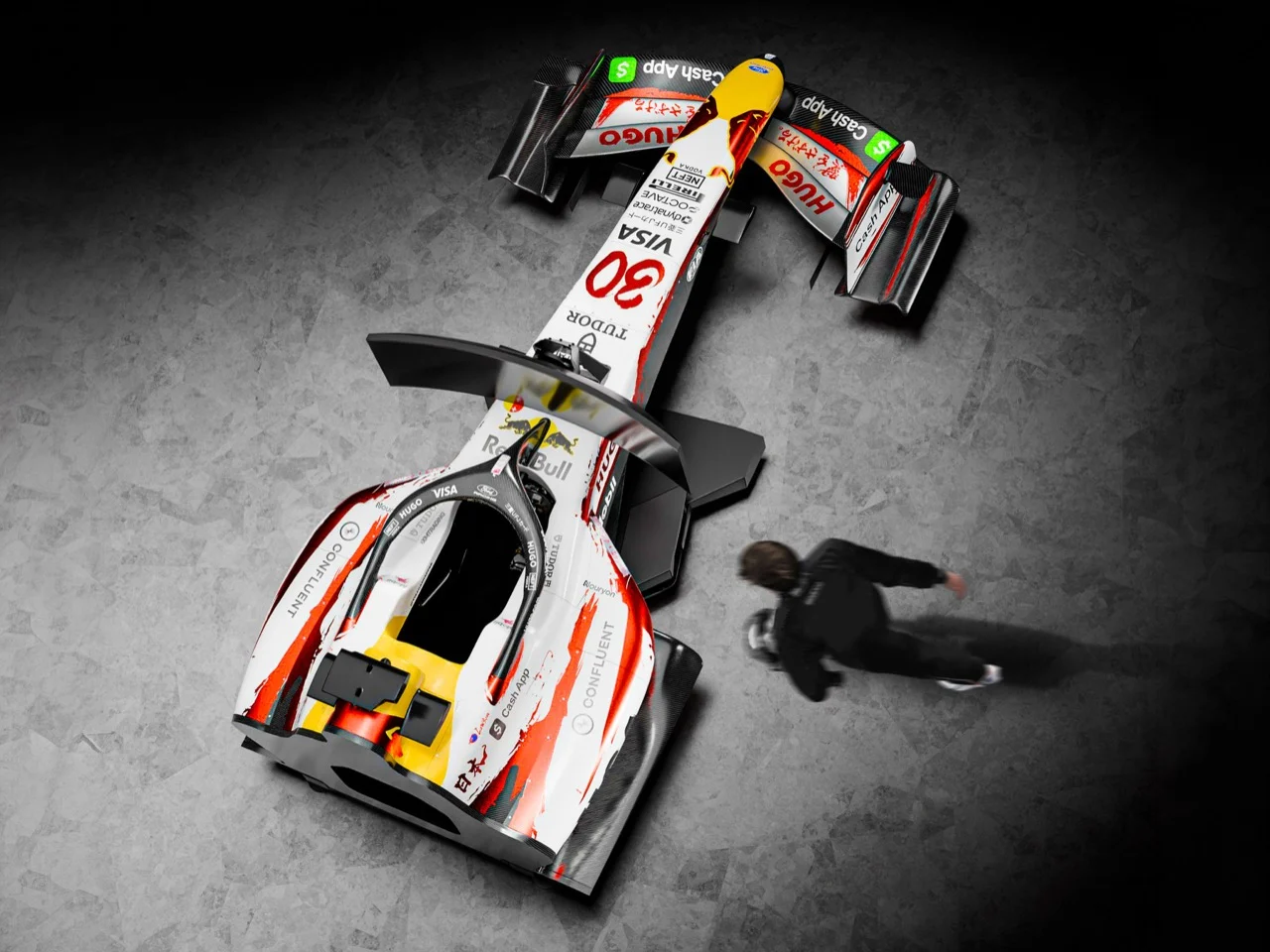 La livrée mérite une attention particulière. La calligraphie d’Aoyagi crée une vraie dynamique visuelle, qui impressionne tant à grande vitesse que lorsqu’elle est immobile. Le fond blanc offre un espace suffisant aux traits rouges et argentés. À Suzuka, à pleine vitesse, l’unicité de la Cherry Edition se manifeste sous forme d’un graphique audacieux et contrasté. Pendant l’événement à Shibuya, elle semblait plutôt un véritable tableau sur roues. Cette dualité, oscillant entre graphisme dynamique et œuvre d’art soignée, rend les voitures irrésistibles pour l’expérience du simulateur, se penchant ainsi sur la texture et les détails autour de soi.