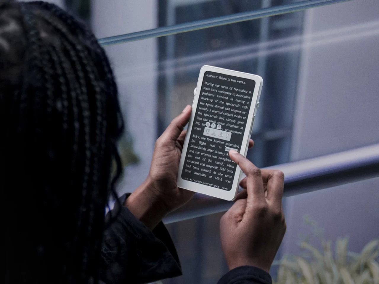 Le Smart Dial, un des points forts du design du Krono, remplace les menus tactiles souvent peu intuitifs des appareils à encre électronique. Ce bouton rotatif, monté sur le côté, permet de contrôler le rafraîchissement de l’écran, l’ajustement de la lumière frontale et l’enregistrement vocal, donnant un aspect mécanique et tactile à un dispositif qui, habituellement, en est dépourvu. À l’arrière, le Krono est équipé d’un strip appelé Axis, qui comprend six petites lumières à intensité variable, s’allumant pour inciter l’utilisateur à se concentrer sur la lecture ou le travail. Cette caractéristique, bien qu’originale, confère un sens au produit, misant sur une utilisation axée sur l’attention.