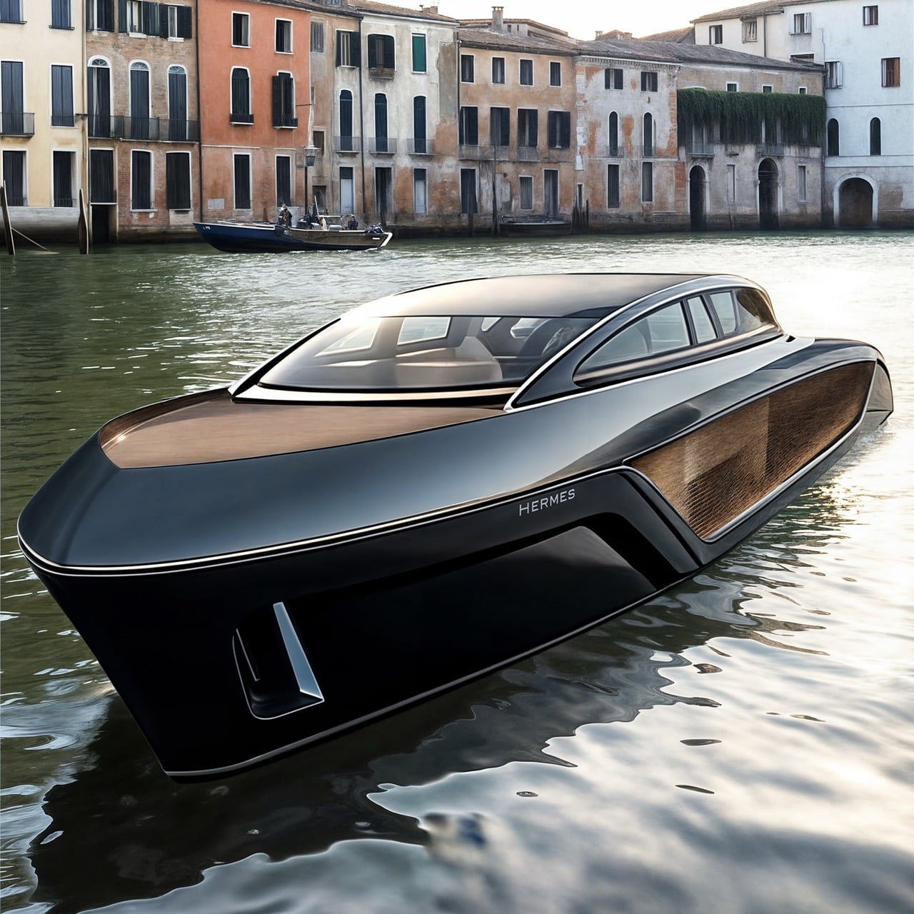 Dans les canaux de Venise, les gondoles traditionnelles glissent harmonieusement entre des bâtiments anciens, tandis que le yacht Hermès attire l’attention avec sa forme angulaire et contemporaine. Conçu par Paolo Demel, ce vaisseau conceptuel incarne ce qu’il décrit comme une « élégance futuriste ». Ce concept lie l’art du nautisme de luxe à la précision et à l’esthétique du design de haute couture.