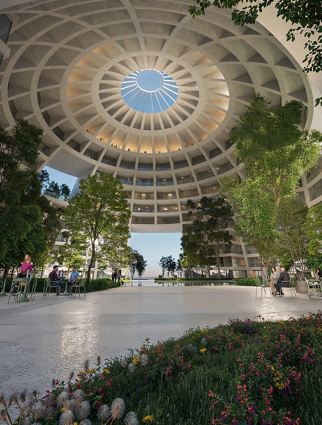 L’ambition technique de ce projet s’aligne avec sa audace formelle. Concevoir une sphère de cette taille requiert des solutions structurelles sophistiquées, notamment pour répondre aux demandes spatiales variées des sièges d’arène, des chambres d’hôtel et des agencements résidentiels au sein d’une enveloppe courbée continue. La façade griddée remplit probablement des fonctions structurelles aux côtés de sa fonction esthétique, répartissant les charges sur l’ensemble de la surface. Ce projet représente une rupture avec l’approche fragmentée typique des développements à usage mixte. Au lieu de regroupes séparés autour d’une place partagée, MVRDV consolide tout en un seul objet.