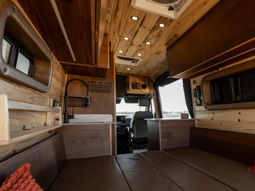 Dès l’entrée, l’intérieur de la van révèle tout son charme. Les murs et ceils en bois de pin créent une atmosphère chaleureuse, tandis que les armoires et connecteurs offrent une utilité appréciable. L’alimentation électrique est assurée par deux batteries Victron de 12,8 volts et 500 ampères, alimentées par un panneau solaire de 500 watts. Un système d’inverseur Victron garantit un éclairage optimal, même lorsque le soleil ne peut fournir l’énergie requise. À l’arrière, une dinette convertible offre une polyvalence inégalée, alors qu’une kitchenette se trouve à mi-chemin, adjacente à la porte latérale.