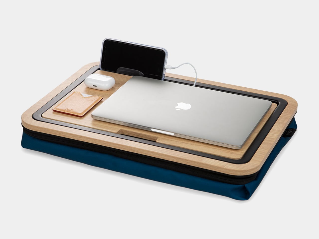 Une fente sur le bord arrière permet de maintenir un téléphone ou une tablette en position verticale, transformant le bureau lap en un petit centre de commande avec plusieurs écrans. La surface en chêne est entourée d’une faible bordure sur trois côtés, empêchant ainsi que les appareils et les stylos glissent lorsque vous changez de position. Le résultat est une plateforme stable, semblable à une petite table, offrant suffisamment d’espace pour éviter que les objets ne tombent dans les couvertures.
