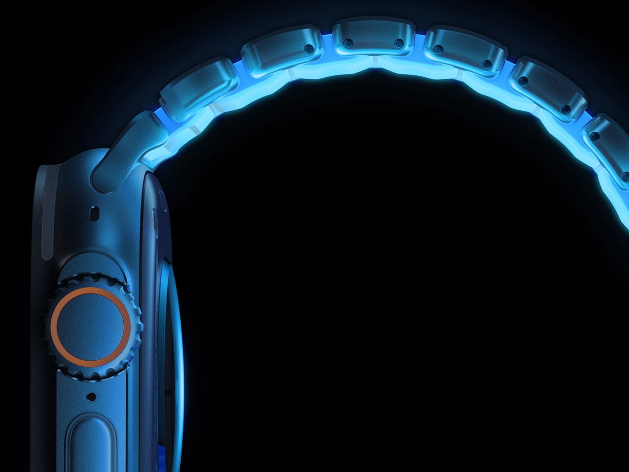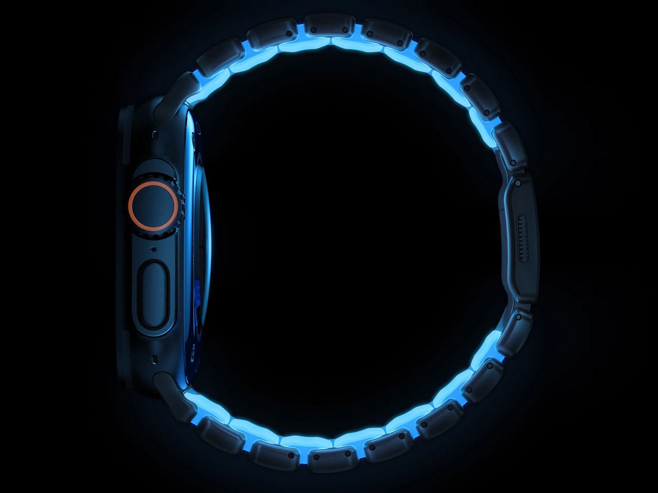 La version Icy Blue Glow se distingue par son matériau photoluminescent intégré dans les maillons intérieurs en FKM. Ce composé absorbe la lumière toute la journée et émet une douce lueur bleue dans des conditions de faible luminosité, offrant un accent visuel intéressant dans l’obscurité.