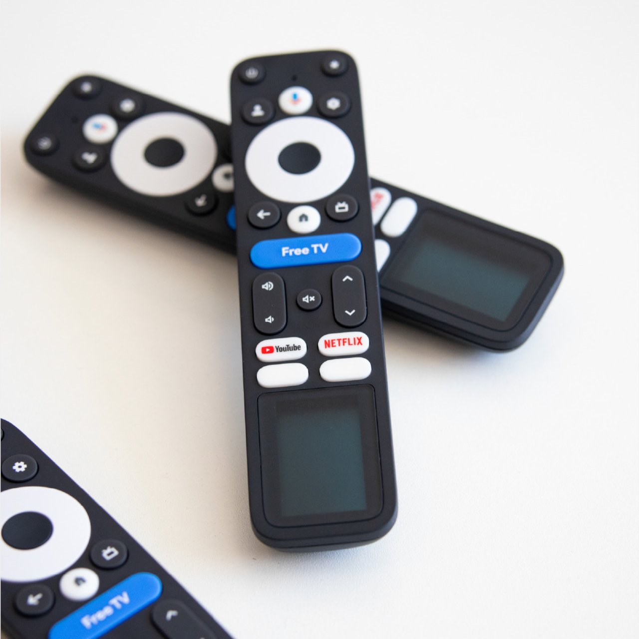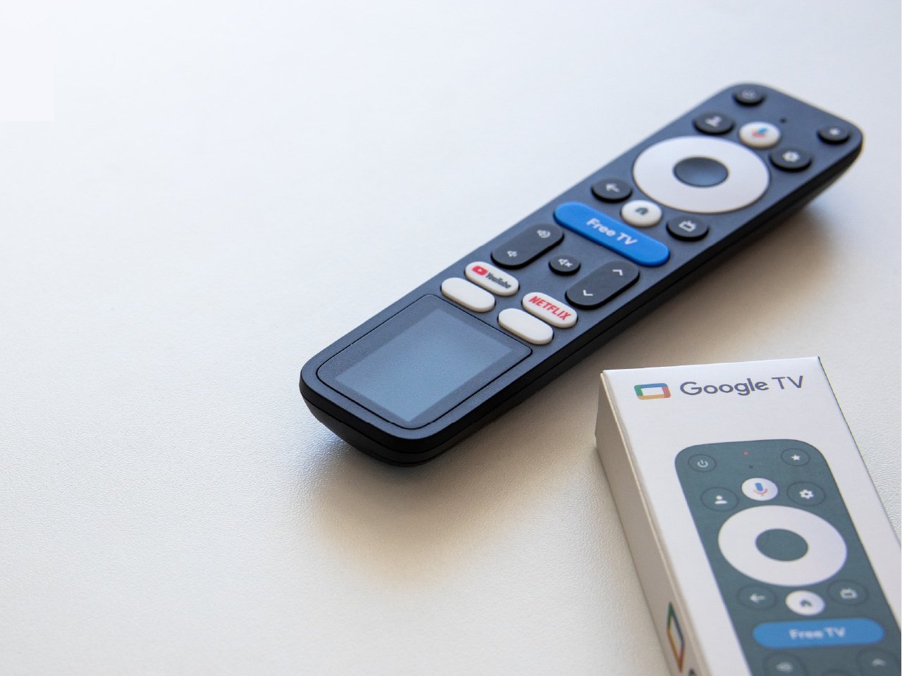 La G32 conserve la disposition familière de Google TV. Un grand D-pad circulaire se trouve en haut, avec des boutons pour le retour et la page d’accueil, des boutons dédiés pour YouTube et Netflix, ainsi qu’une touche « TV gratuite » en bleu vif au centre. L’espace solaire occupe le tiers inférieur. Sur les photos, elle ressemble à une télécommande Google TV classique, mais dotée d’un écran supplémentaire en bas, qui est en réalité la zone de captation de lumière.