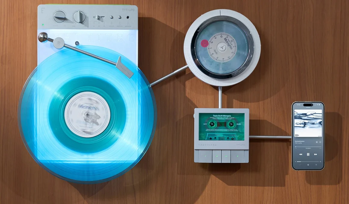La série TTT de TRETTITRE combine ces instincts de manière difficile à catégoriser. Le TTT-LP3, un tourne-disque sans fil, utilise de l’aluminium usiné par CNC pour son cadre principal et est équipé d’un panneau lumineux diffus qui répartit la lumière de manière uniforme sur sa surface pendant la lecture de musique. Le TTT-DP3, un lecteur CD Bluetooth, s’inspire d’une forme de soucoupe volante avec un couvercle magnétique transparent qui s’ouvre pour révéler le disque en rotation. Enfin, le TTT-CP3, un lecteur de cassettes, arbore un boîtier en métal avec des lignes géométriques nettes et des touches mécaniques offrant un retour physique évident. Tous trois peuvent se fixer sur le support mural modulable TTT-W, transformant la lecture de médias physiques en une partie visible et fonctionnelle de la décoration intérieure.