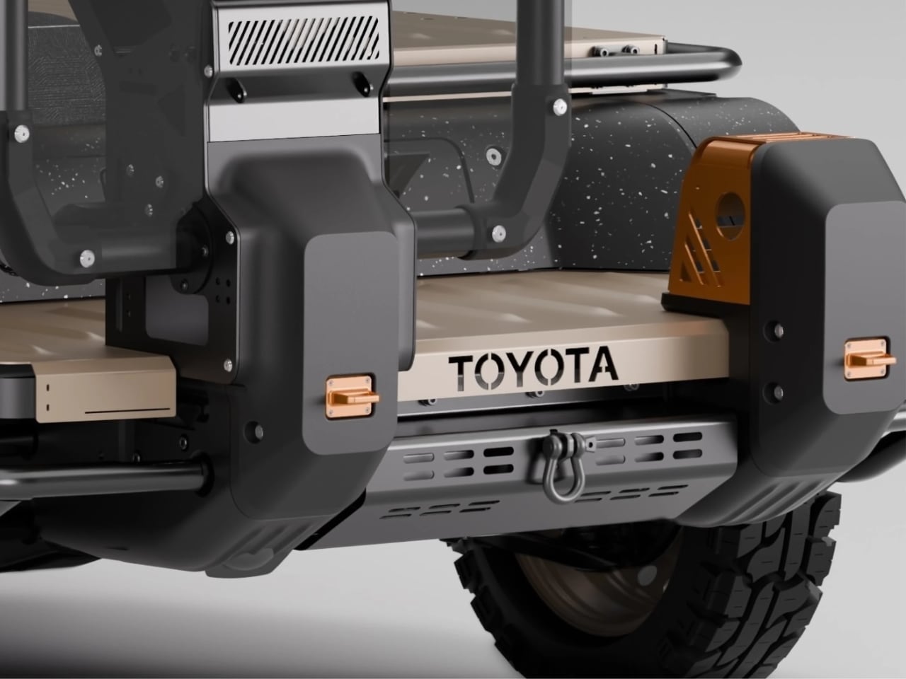 La visibilité du châssis fonctionne presque comme un diagramme d’instructions pour les constructeurs locaux. Rails exposés, surfaces de montage visibles et géométrie structurelle non obstruée signalent exactement où les modules peuvent être fixés. Un fabricant examinant ce concept de camion modulaire n’a pas besoin de manuel pour déterminer où une caisse de chargement pourrait être boulonnée ou où une fermeture de cabine pourrait s’attacher. La forme dépouillée communique sa propre logique, révélant les chemins de charge et les points de connexion simplement par l’acte de les laisser visibles. La décision de Toyota d’expédier le véhicule inachevé devient, à cet égard, une forme de communication par le design : la géométrie elle-même apprend à l’utilisateur comment le compléter.