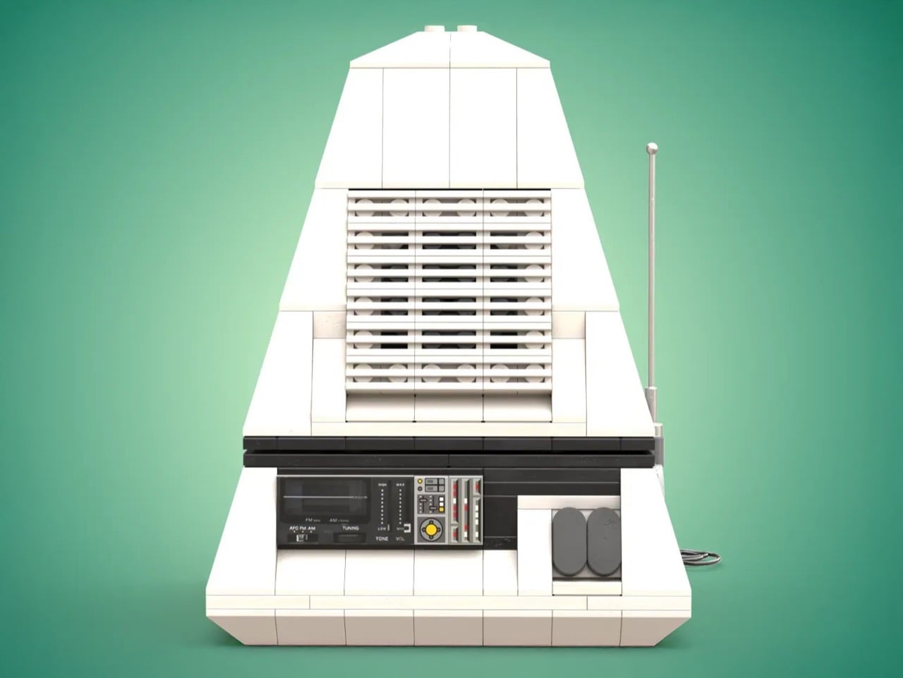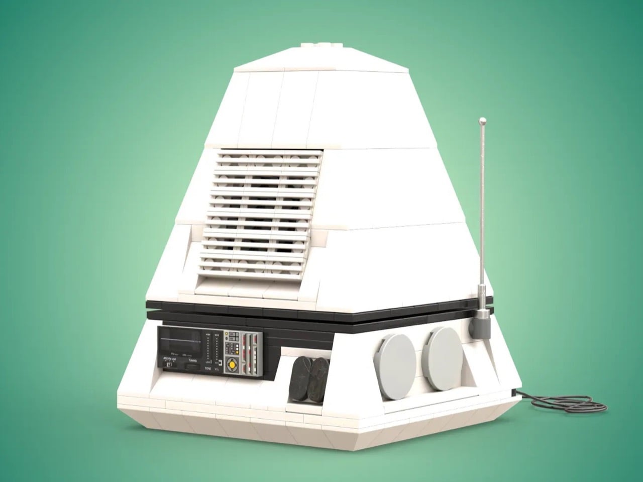 Ce qui rend la version LEGO de DocBrickJones impressionnante, c’est sa capacité à traduire des courbes et des pentes analogiques dans un médium qui fonctionne principalement avec des angles droits. Les faces inclinées de la base pyramidale utilisent des briques d’inclinaison judicieusement placées pour maintenir des lignes épurées. L’écran bleu, encastré derrière un cadre gris foncé, est complété par des grilles de haut-parleur et des cadrans de contrôle. Il inclut même une antenne télescopique en gris clair, ainsi qu’un câble d’alimentation construit en briques qui s’étend depuis la base. Ces détails sont essentiels car ils démontrent une compréhension profonde de ce qui rendait l’original captivant : l’interaction entre des surfaces lisses et des éléments fonctionnels, le poids visuel de cette large base soutenant un délicat assemblage d’écran, et le contraste entre le corps blanc éclatant et le panneau de commande technique.
