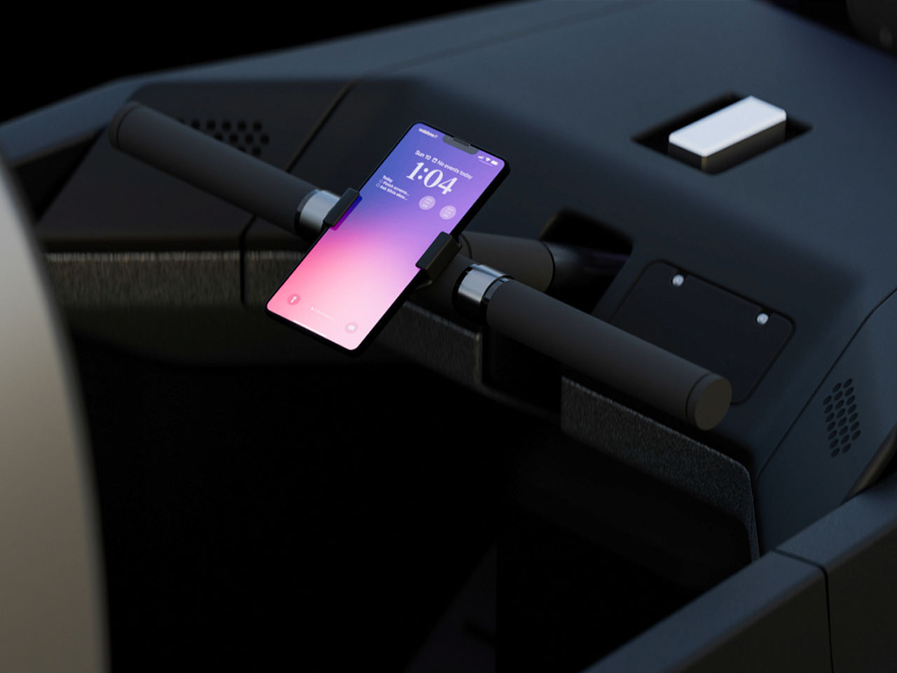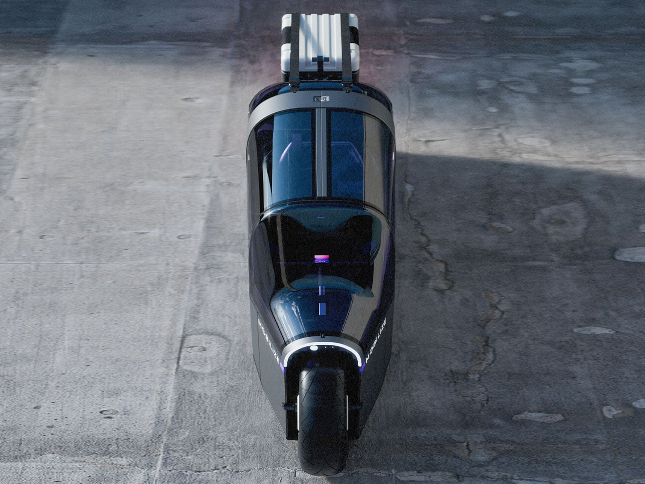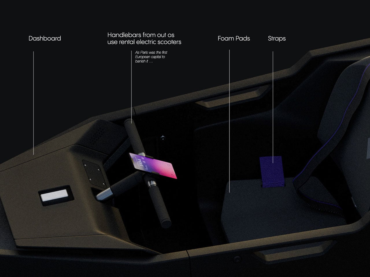 Bien que ce design ne soit pas destiné aux personnes souffrant de claustrophobie, cette coque translucide offre un intérieur privé qui s’avère utile quand le mode auto-conduit est activé. Le cycliste peut se détendre tout en accédant à son fil d’actualité sur les réseaux sociaux grâce à un support de téléphone intégré au système de direction, qui ressemble davantage à un guidon moderne. De plus, de l’espace est prévu derrière la selle pour ranger des objets personnels, permettant d’allonger ses jambes et de profiter de longs trajets.