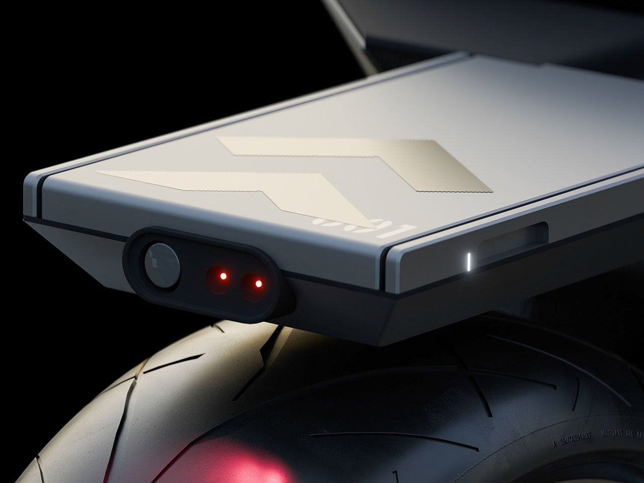 La batterie électrique est intégrée dans la partie inférieure arrière du vélo, juste au-dessus de laquelle se trouve un support pour le transport d’objets essentiels. L’accès à l’intérieur s’ouvre facilement grâce à un bouton de déverrouillage manuel, permettant de sécuriser le vélo avec une structure métallique légère qui s’étend le long des jantes. L’éclairage avant présente une forme arquée avec des grandes LED distinctives, tandis que les feux arrière sont plus discrets, utilisant uniquement des LED rouges pour alerter les conducteurs derrière.