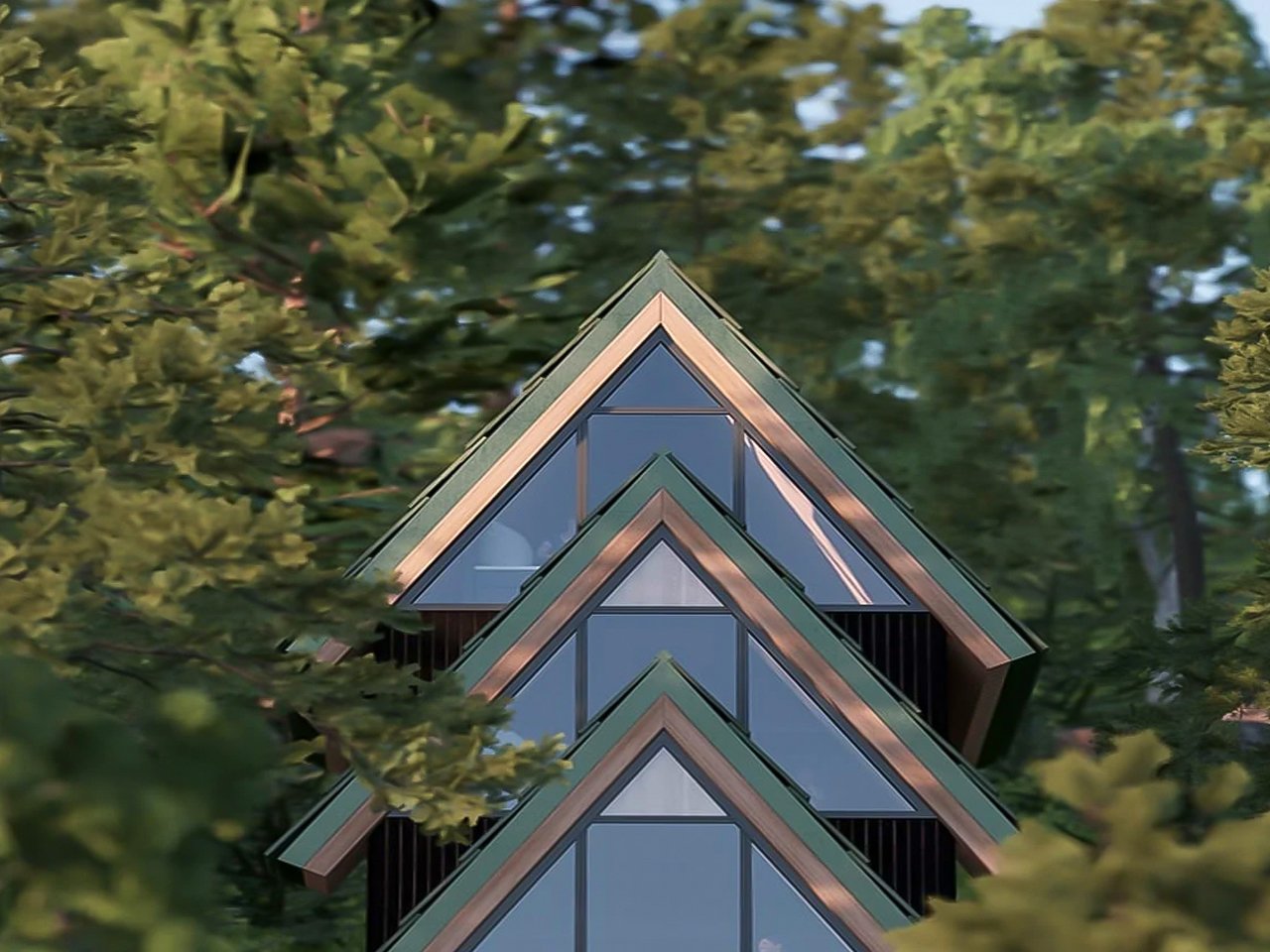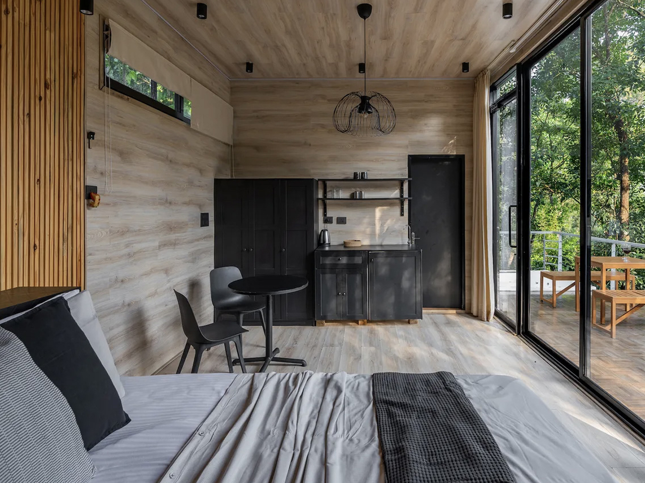 Le plan ouvert inclut de grandes fenêtres pour maximiser la lumière naturelle, ouvrant sur une terrasse sereine avec un jacuzzi et un espace de détente, idéal pour admirer la forêt et observer les étoiles. Une chambre minimaliste chaleureuse ornée de textiles naturels et de finitions en bois dispose d’un lit déplaçable pour profiter du ciel nocturne. Réfléchie, Reflections offre une échappatoire paisible et éco-consciente à la vie urbaine.