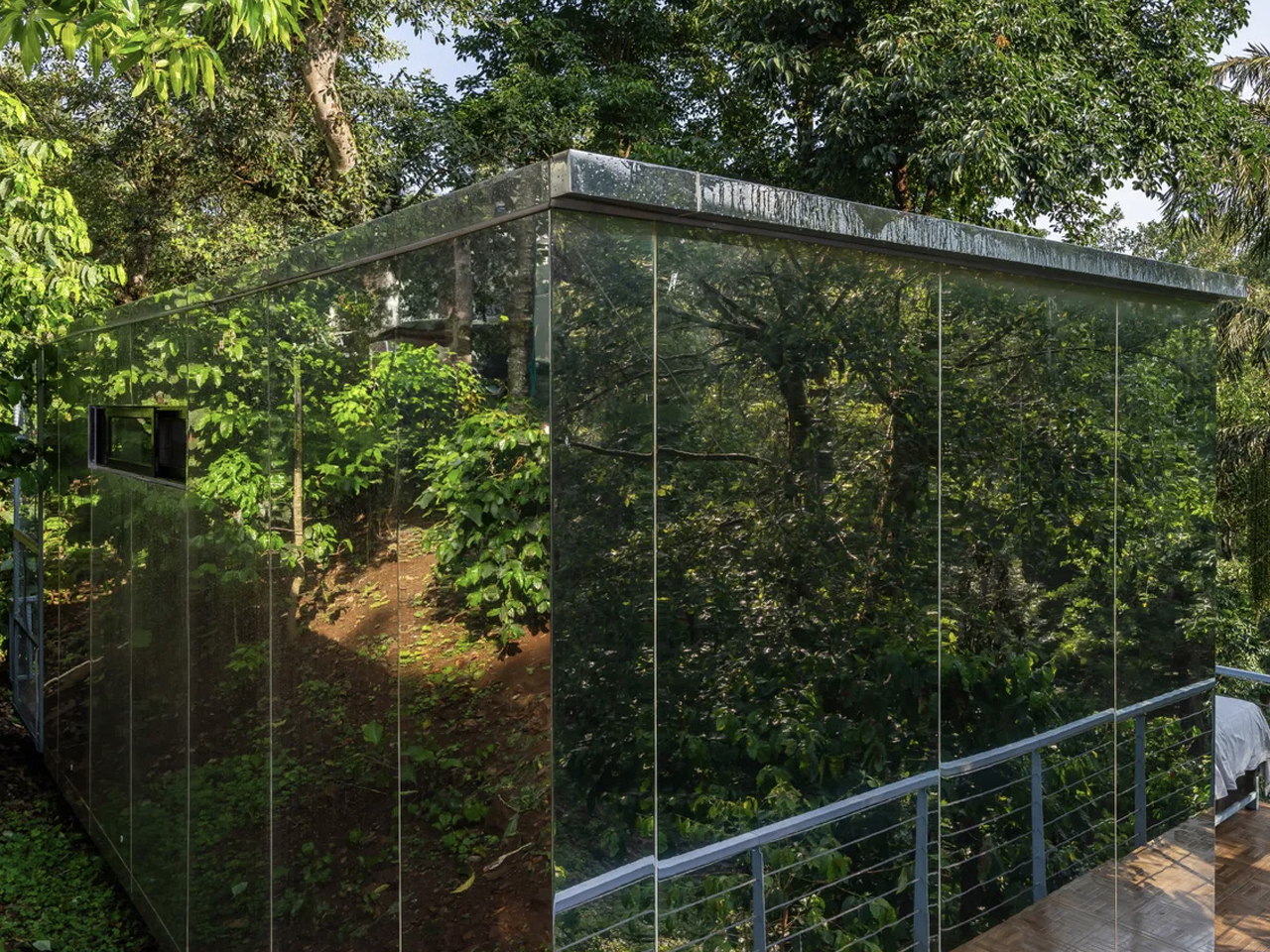 Reflections by Okno Modhomes, par exemple, est une maison de vacances de 28 mètres carrés conçue pour coexister harmonieusement avec la nature dans les jungles de Chikmagalur, au Karnataka. Sa façade miroir reflète la verdure environnante, aidant la structure à se fondre visuellement dans son environnement. Édifiée avec des matériaux durables et des systèmes énergétiquement efficaces, la maison se distingue par des accents modernes et des éléments en bois qui ajoutent une charmante touche terrestre.