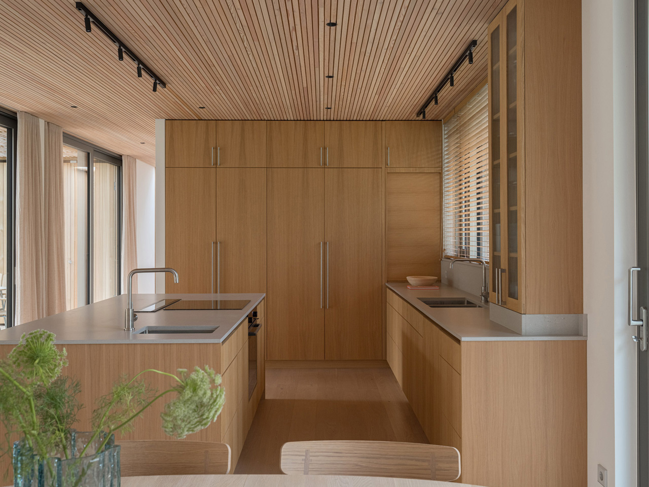 La disposition sépare les zones privées et communes, les chambres offrant des vues sur les cimes au nord et une cuisine et un salon baignés de lumière au sud. Une terrasse en retrait donne sur l’ouest, idéale pour les dîners au coucher de soleil. Les intérieurs présentent des sols en chêne, des plafonds en mélèze, et un agencement sur mesure pour un aspect chaleureux et cohérent. Les lucarnes illuminent le couloir de lumière naturelle, tandis que des stores en bois assurent intimité et un effet cocon. Sous la maison surélevée, un espace protégé fait office de salle de jeux et de protection contre de futures inondations côtières.