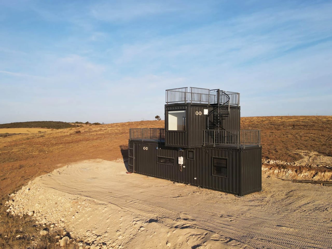 Mark T de Sonic Steel, à Port Neil en Australie, présente un design empilé avec trois conteneurs, offrant création et séparation des espaces. Le premier niveau abrite le salon, un deuxième module pour la cage d’escalier et un dernier pour la chambre principale, le tout habillé d’une peinture noire élégante.