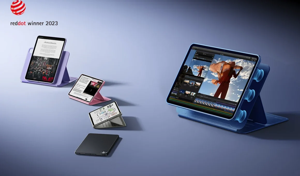 Avec un poids combiné d’environ 187 grammes pour la configuration de 13 pouces, la coque offre neuf configurations de position différentes. Les angles permettent tant un visionnage en paysage qu’une prise de notes optimale pour l’Apple Pencil. De plus, elle charge le Pencil magnétiquement tout en étant dans la coque.