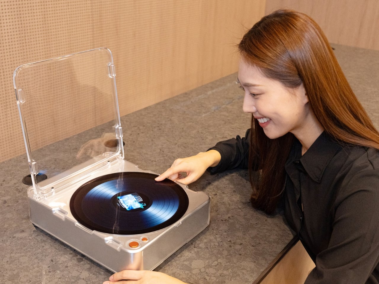 L’AI OLED Turntable est un tourne-disque avec un écran tactile OLED circulaire de 13,4 pouces. Il peut afficher des images et des vidéos tout en jouant de la musique, créant une ambiance visuelle correspondant à votre playlist.