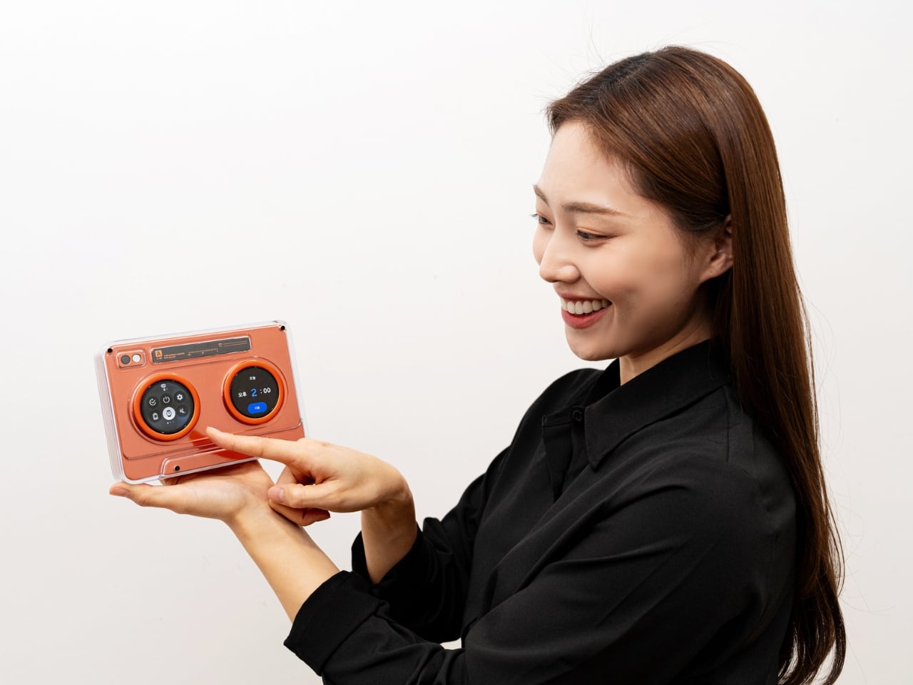 La Cassette OLED IA reprend le design classique des lecteurs de cassettes et le transforme en haut-parleur intelligent. Doté de deux petits écrans OLED circulaires de 1,5 pouces, cette innovation se démarque. À gauche, les contrôles de lecture ; à droite, une forme d’onde numérique ou un égaliseur. Ces écrans tactiles permettent une interaction directe sans avoir à utiliser son téléphone, offrant une expérience plus immersive.