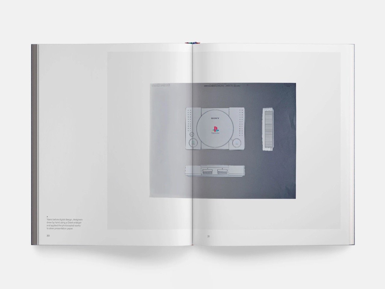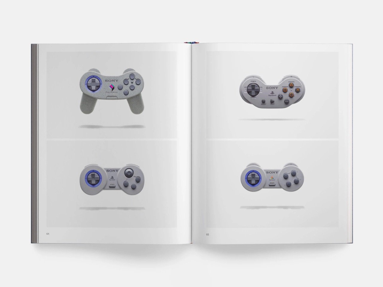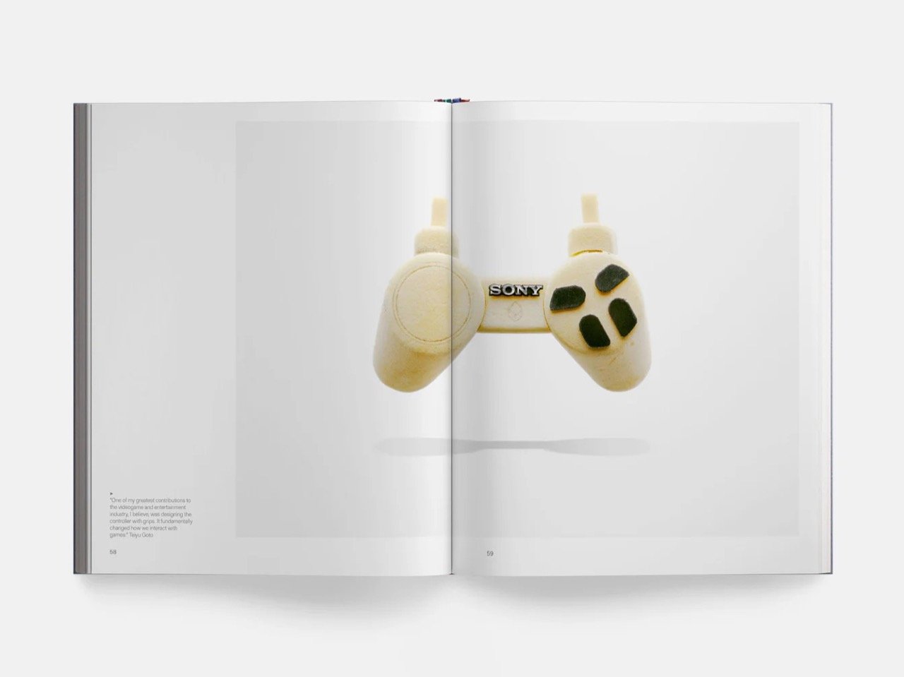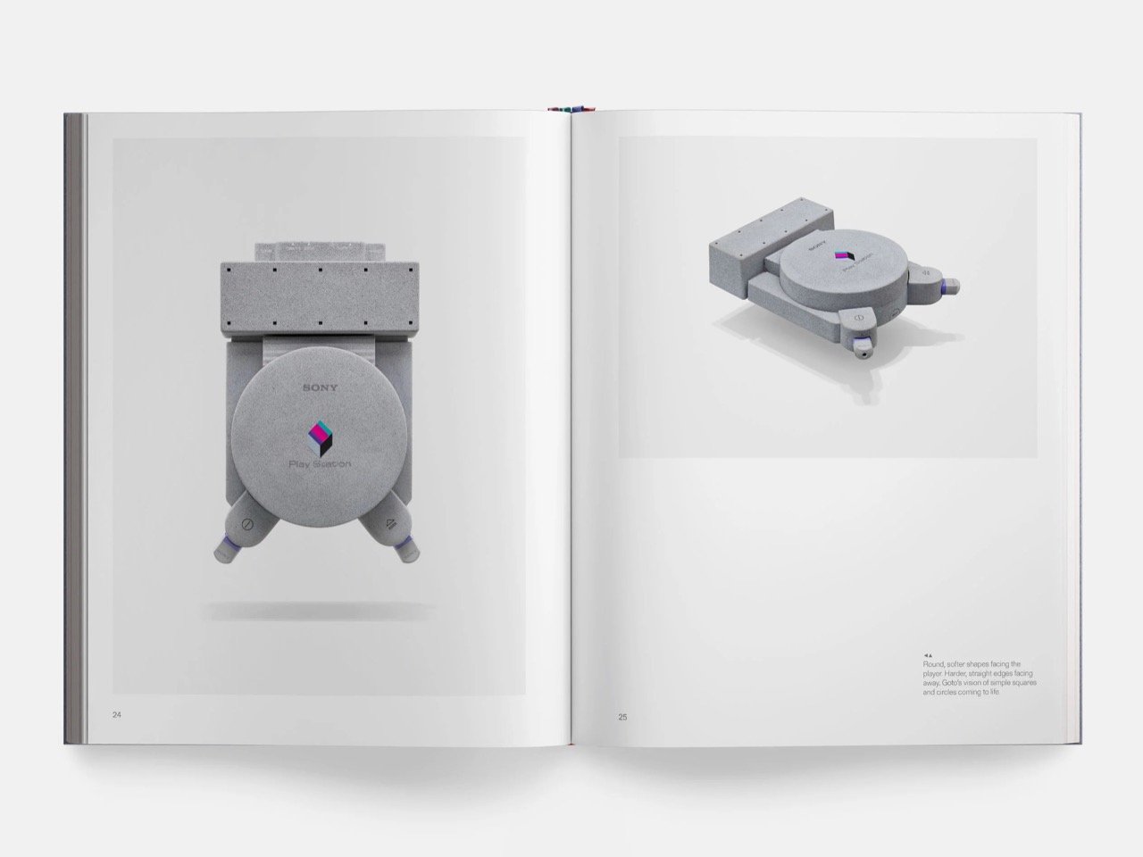 Le livre présente des photographies de prototypes de consoles, d’itérations de contrôleurs, ainsi que des pages dédiées à l’évolution du logo PlayStation, illustrant le processus de design derrière la marque.