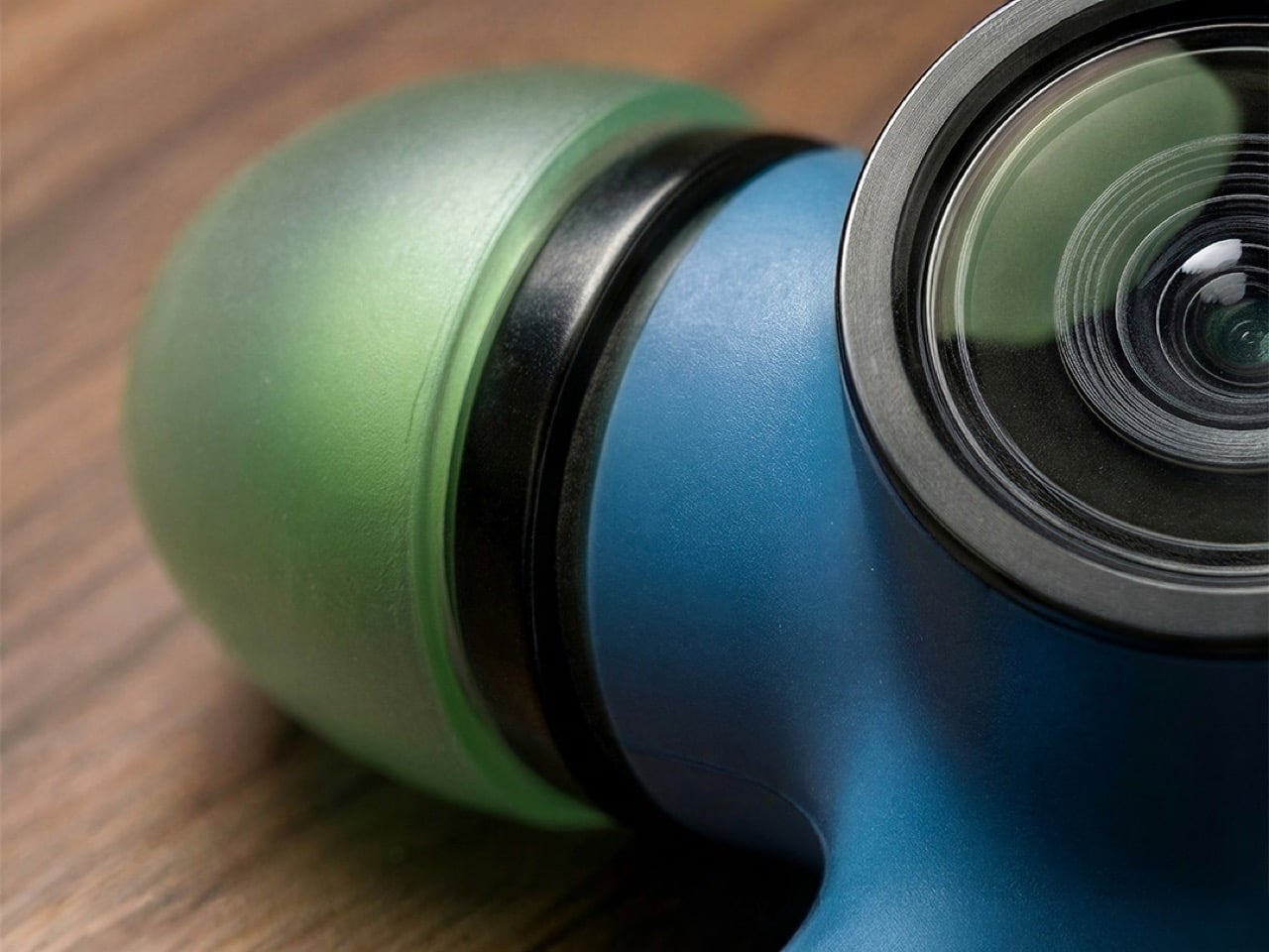 En termes de design industriel, ces écouteurs évoquent une esthétique futuriste. La lentille est placée à l’extrémité de la tige, semblable à une petite caméra d’action, entourée d’un anneau qui sert également d’accent visuel. Cette réalisation n’apparaît pas comme un ajout superflu, ce qui est essentiel lorsque vous portez des optiques sur votre tête. Les coques colorées et les embouts translucides apportent une touche ludique, maintenant l’aspect premièrement audio avant celui de la photographie.