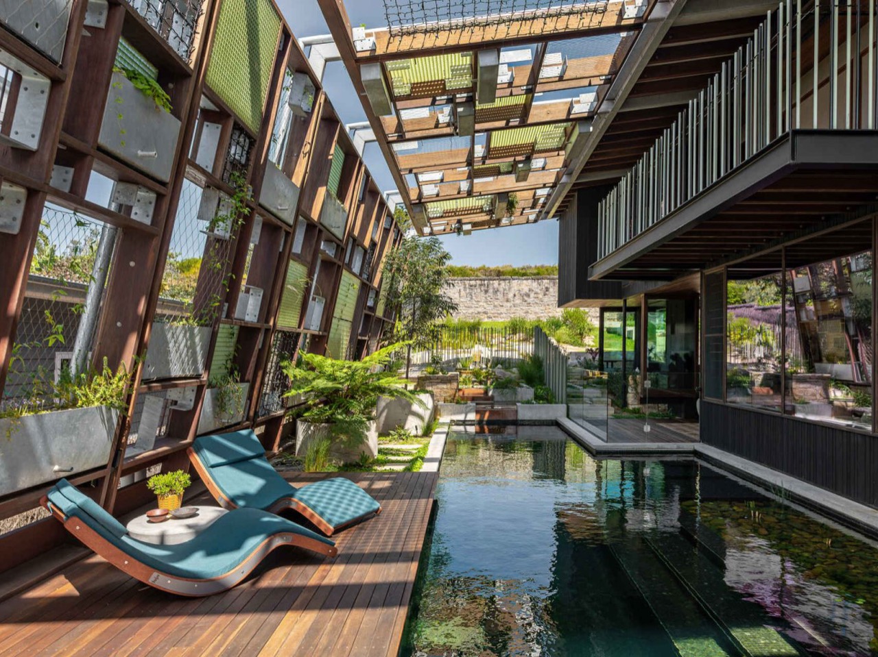 Au-dessus de ce cours d’eau central, un ensemble de jardinières flottantes et de panneaux géométriques se déploie, constituant un microclimat unique. Les poutres en bois s’entrelacent avec de l’acier structurel, tandis que des panneaux translucides en plastique renforcé en fibre jouent avec la lumière. Les plantes débordent des caissettes suspendues, créant une atmosphère à la fois technique et organique. Cet agencement innovant rappelle les labyrinthes d’Escher, où chaque dimension du jardin semble imbriquée dans l’espace.