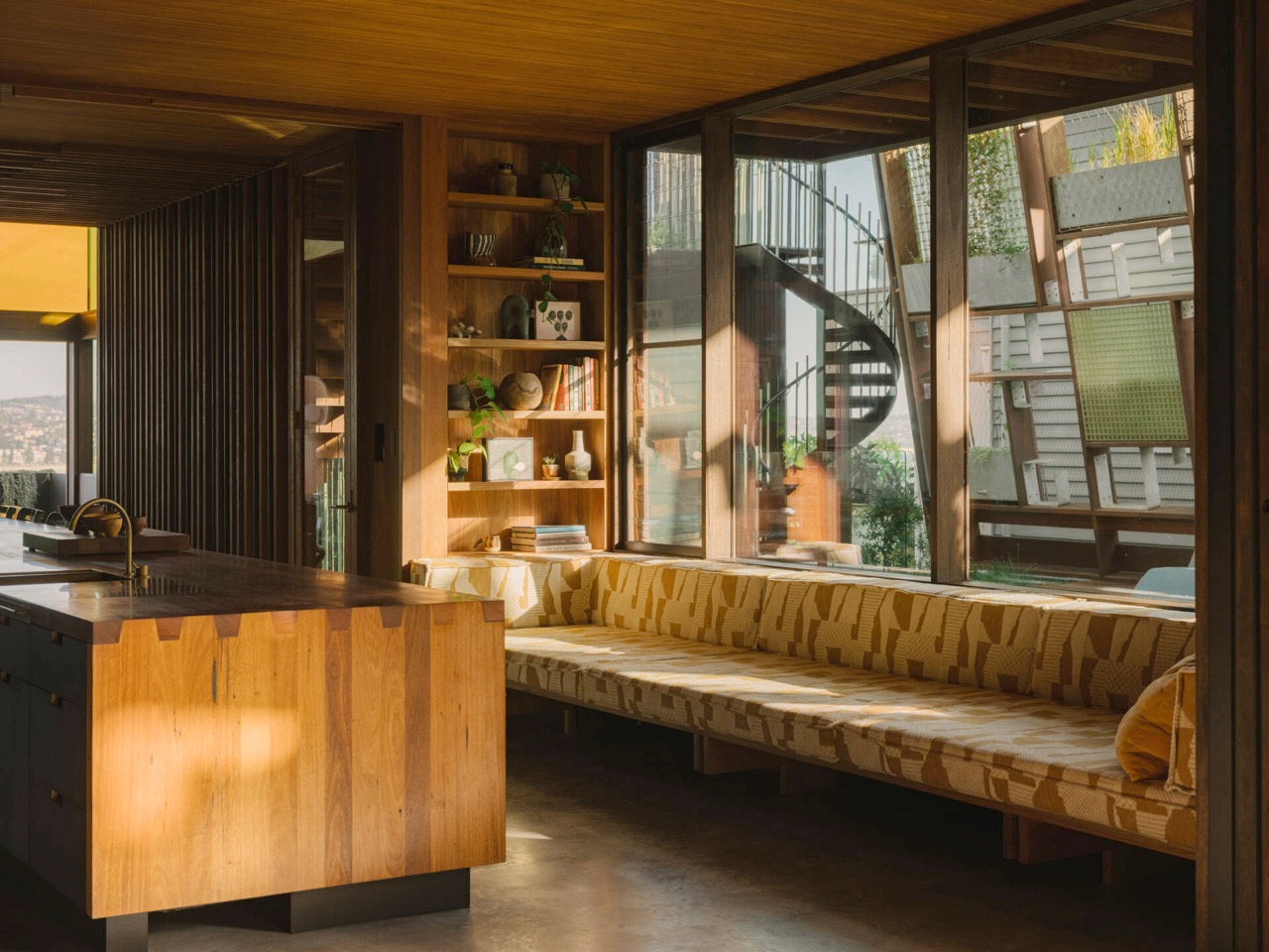 La façade extérieure se distingue par son revêtement en eucalyptus tacheté ayant subi le traitement Shou Sugi Ban, une technique japonaise de carbonisation qui améliore la pérennité du bois. Ce choix de matériau à faible énergie embodied est conçu pour vieillir harmonieusement dans le climat côtier à proximité de Shelly Beach.