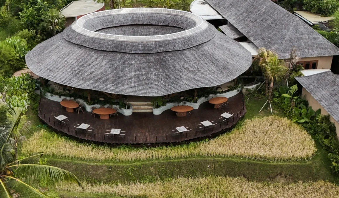 Cette conception est l’œuvre de Pablo Luna Studio, qui a imaginé un restaurant balinais où le climat agit comme un collaborateur essentiel. L’édifice adopte essentiellement une forme circulaire, aux couches ouvertes qui permettent à la lumière, à l’air et à l’eau de circuler avec une précision presque théâtrale.