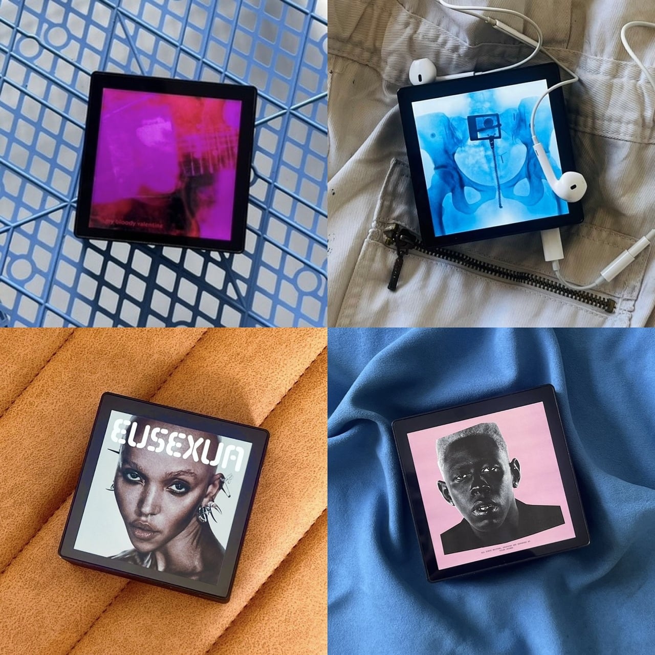 L’écran affiche des œuvres artistiques en haute résolution, des dos de pochettes, des paroles et des crédits fournis par la plateforme Sleevenote. Les utilisateurs peuvent faire défiler les pages de livrets tout en écoutant, et l’interface reste discrète, permettant à l’art de l’album de remplir complètement le carré sans superpositions ni boutons. L’idée principale est que l’appareil devient la couverture d’album pendant que la musique joue, créant une expérience visuelle et auditive plus immersive.