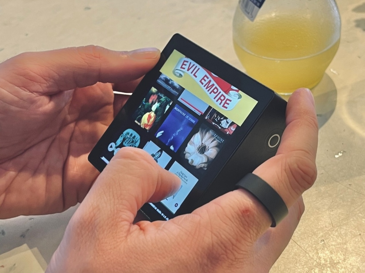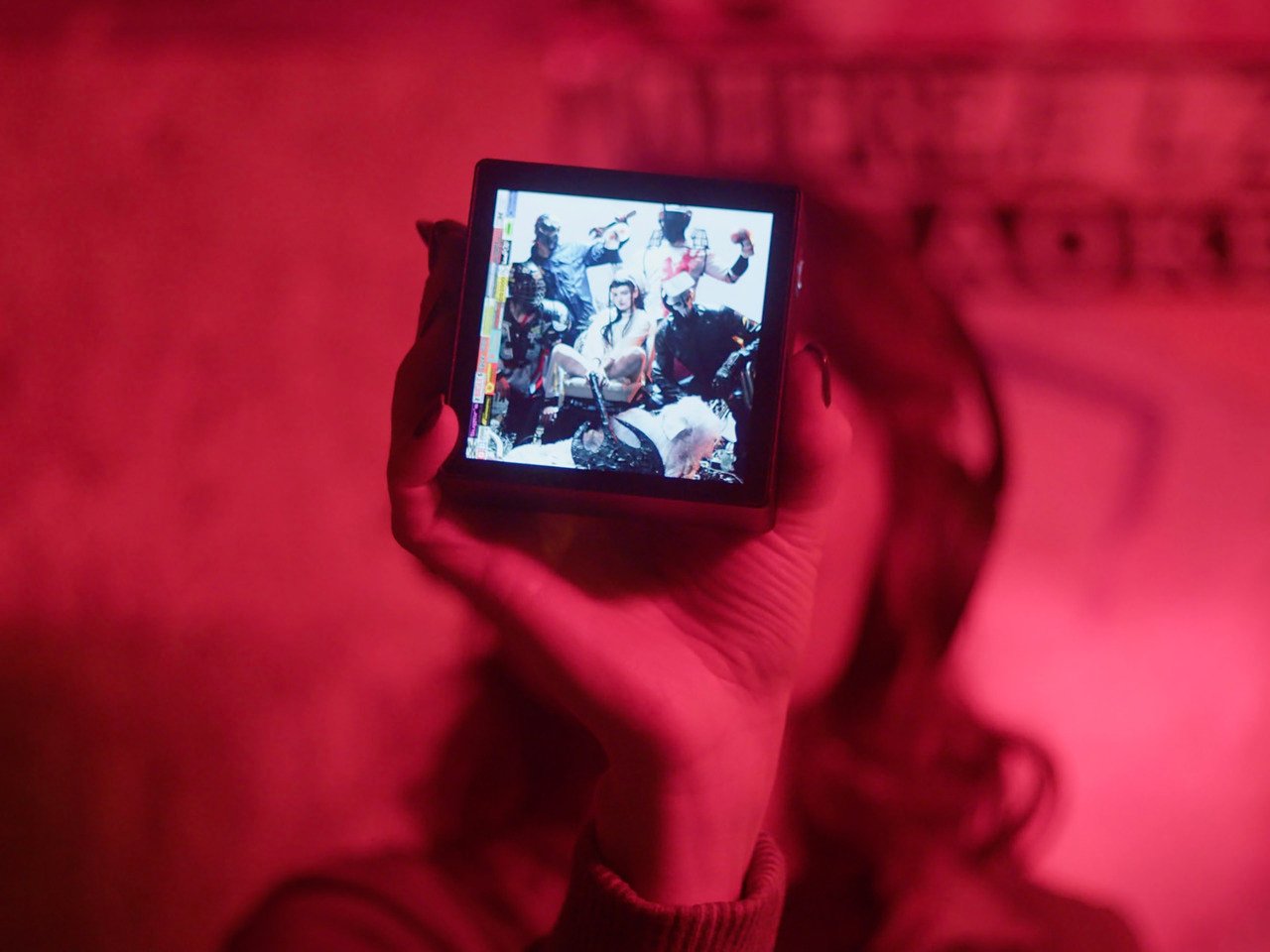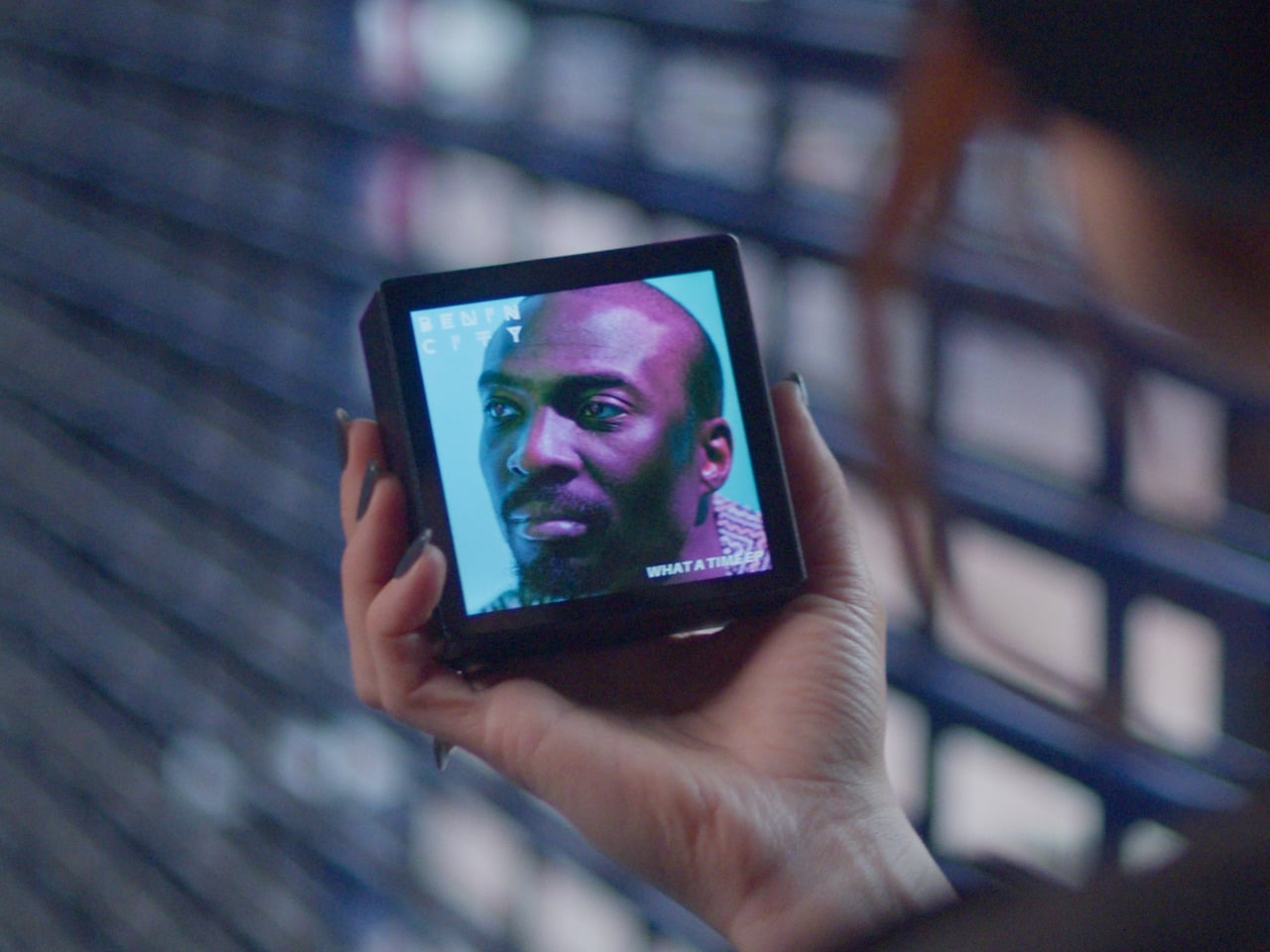 Le matériel est un carré noir, presque entièrement composé d’écran, avec un corps épais et des bords arrondis qui lui donnent l’apparence d’un petit cadre photo plutôt que d’un téléphone. Des boutons de lecture physiques se situent sur un côté, permettant de changer de piste sans toucher l’écran. Lorsqu’on le prend en main, son poids et son épaisseur sont bien perceptibles. Ce n’est pas un appareil destiné à se glisser dans une poche; il est conçu pour reposer sur un bureau ou entre vos mains comme une miniature de pochette d’album.