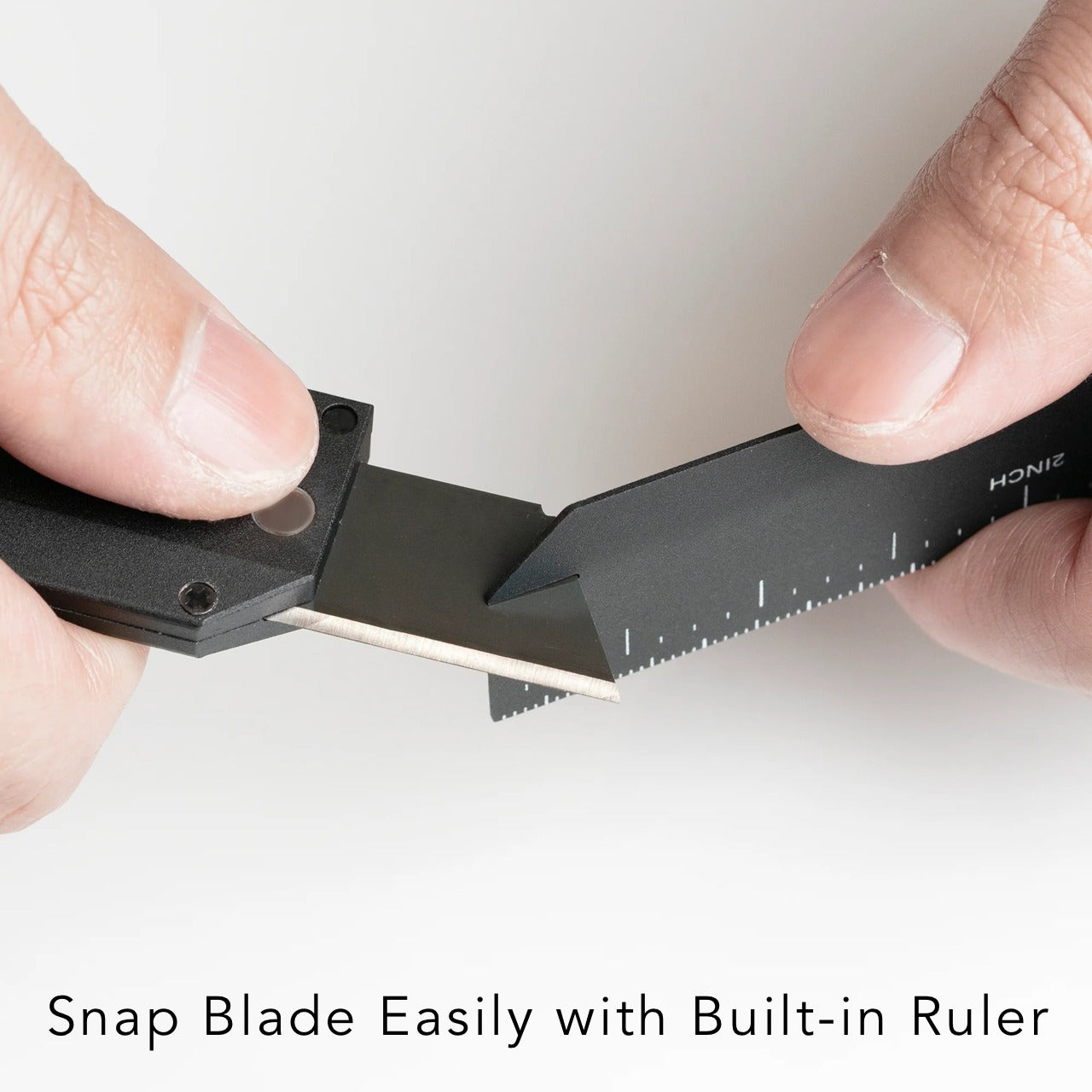 Ce couteau repense l’utility knife. Son corps en métal est extrêmement fin, tandis que la méthode de déploiement par bouton offre une expérience tactile agréable. Le dos magnétique permet de l’accrocher facilement à toute surface métallique, offrant un accès rapide et pratique.